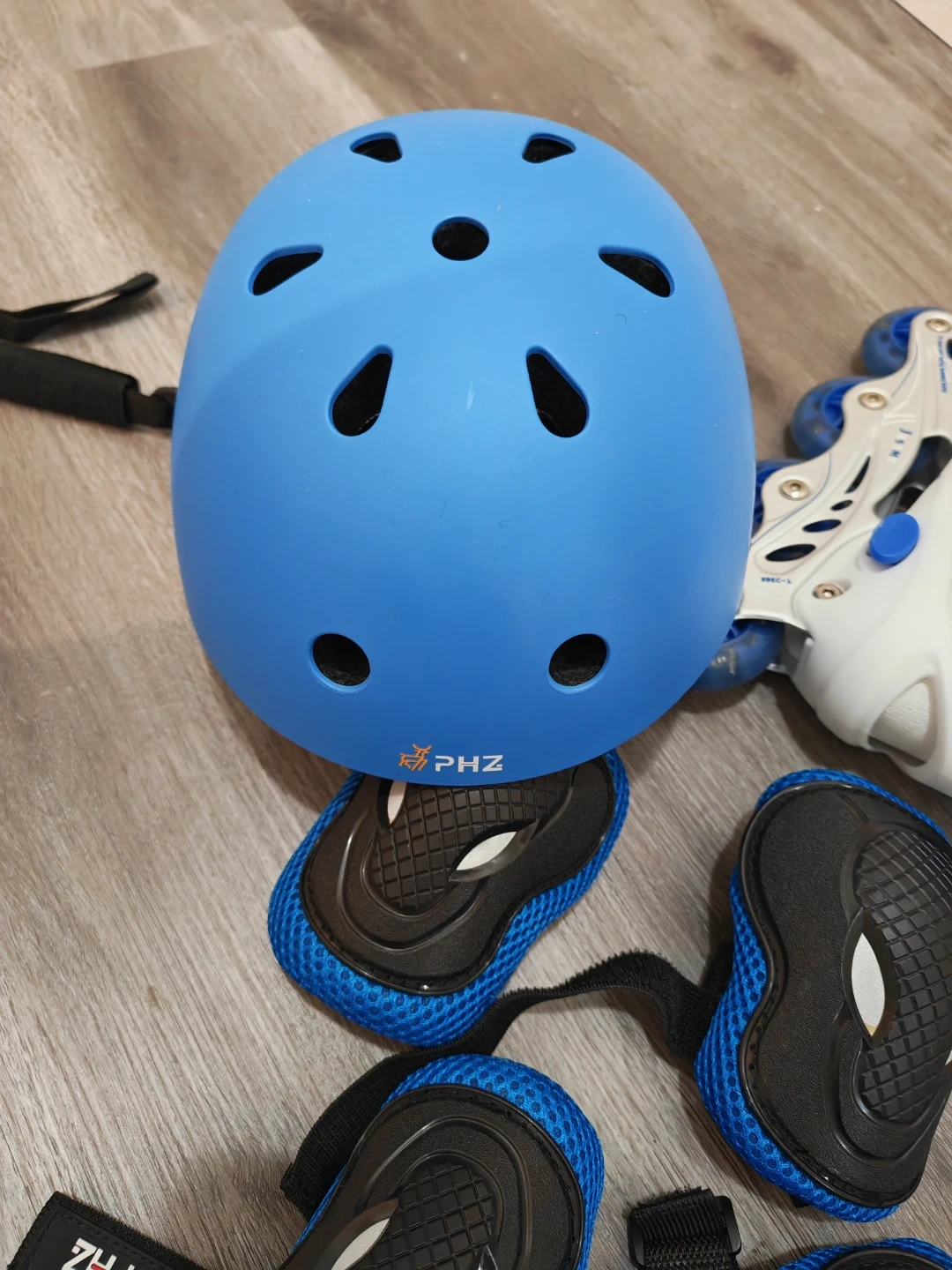 This set includes adjustable rollerblades and a blue safety helmet. Protective gear for knees, elbows, and wrists is also included. The helmet is size S. Great for young skaters learning new skills! Only used twice, like new.