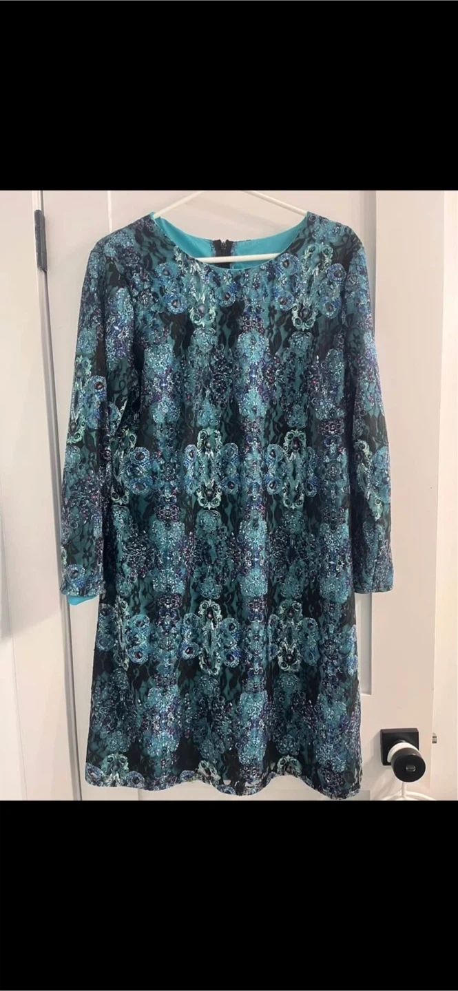 This is a women's long sleeve dress featuring a vibrant teal and blue floral pattern. It has a round neckline and a back zipper closure. The dress is made of a textured fabric.