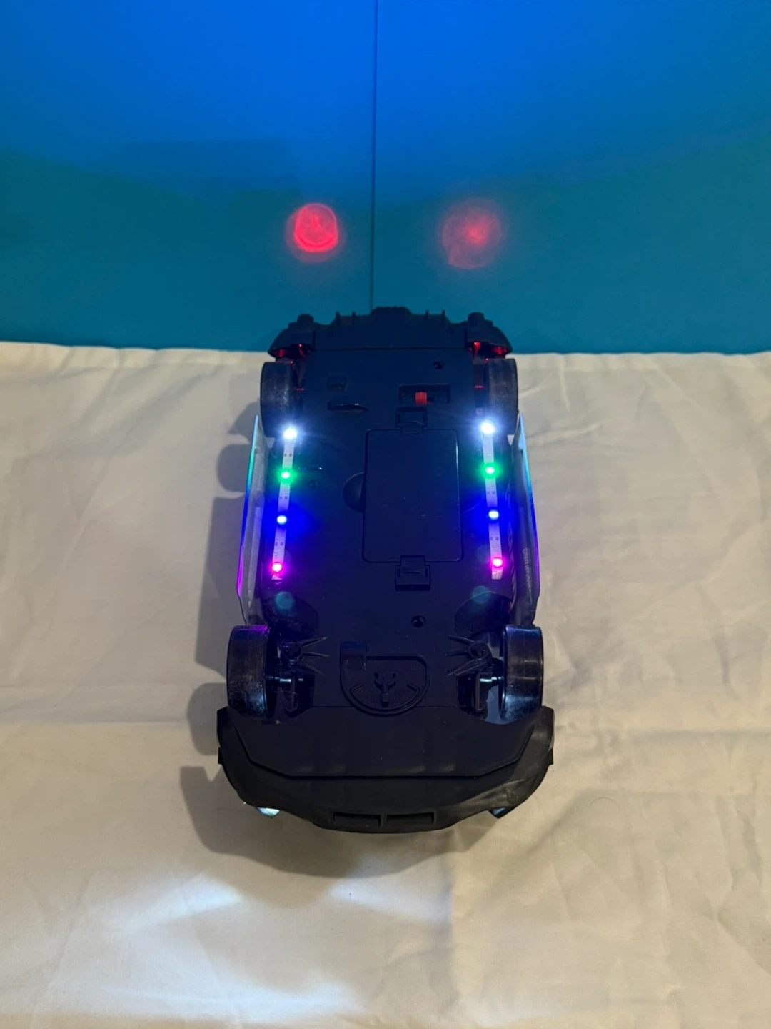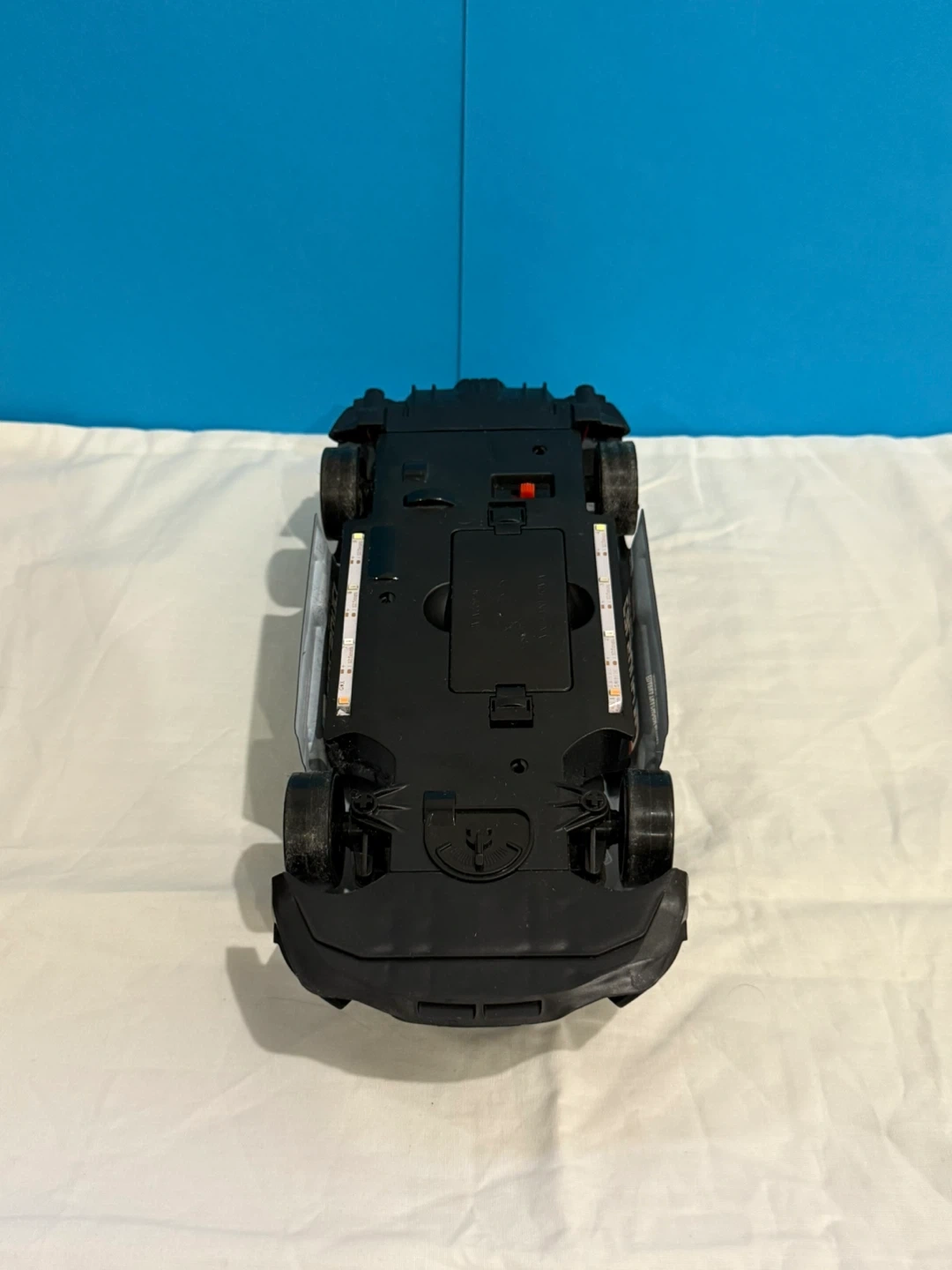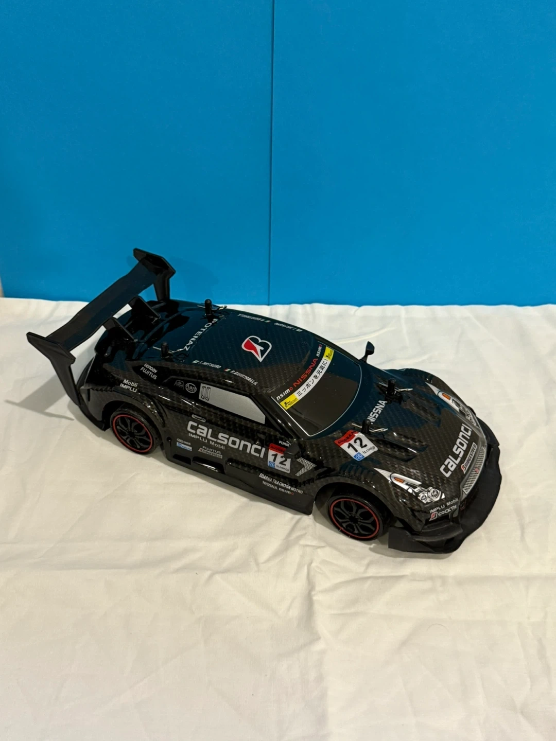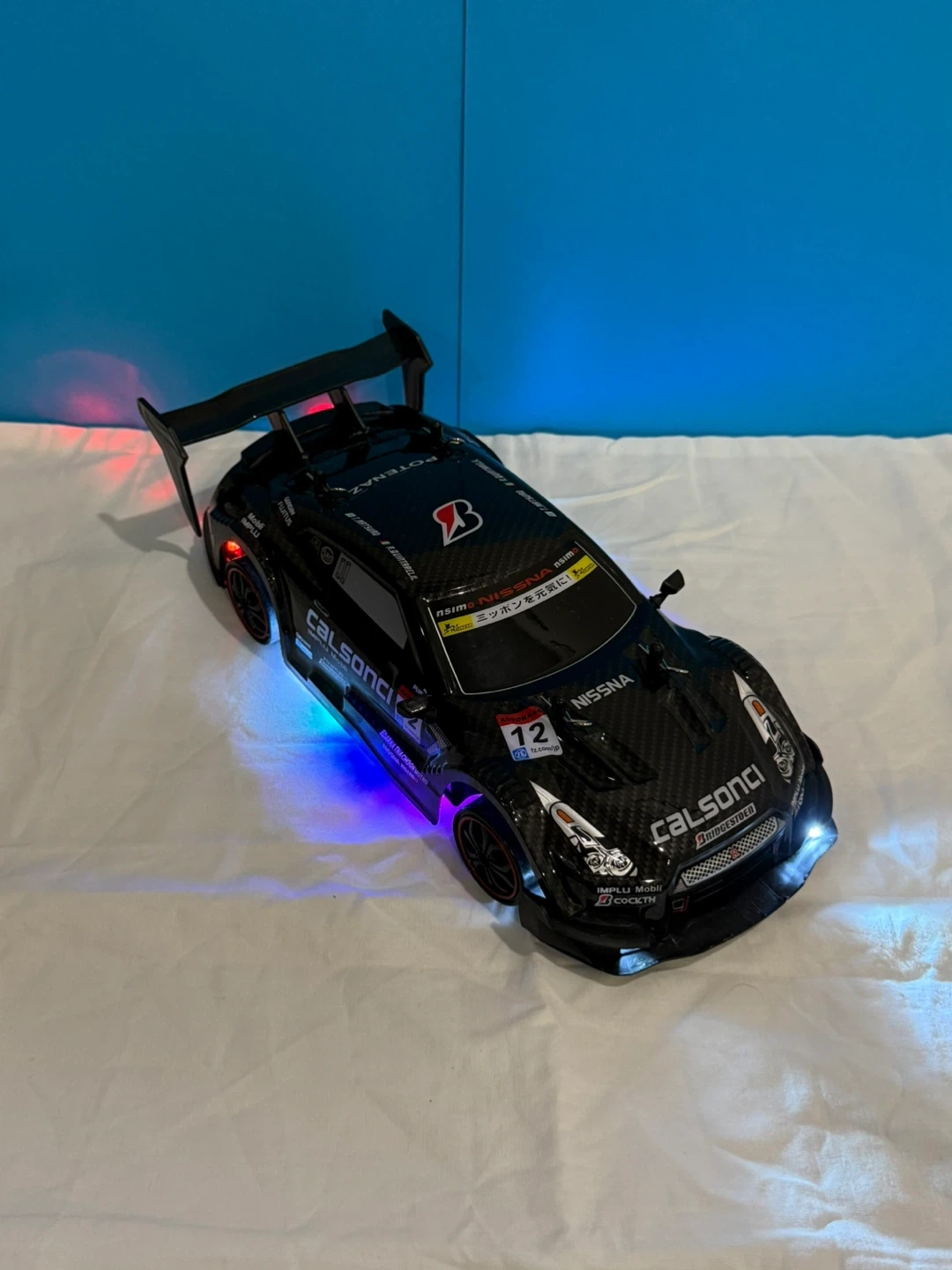 Black remote, RC car with racing decals (Nissan GTR) . Includes a remote controller, 2 chargers, 2 batteries with front, back and bottom colourful LED lights for riding in the dark. It is built to drift around the house or anywhere else.