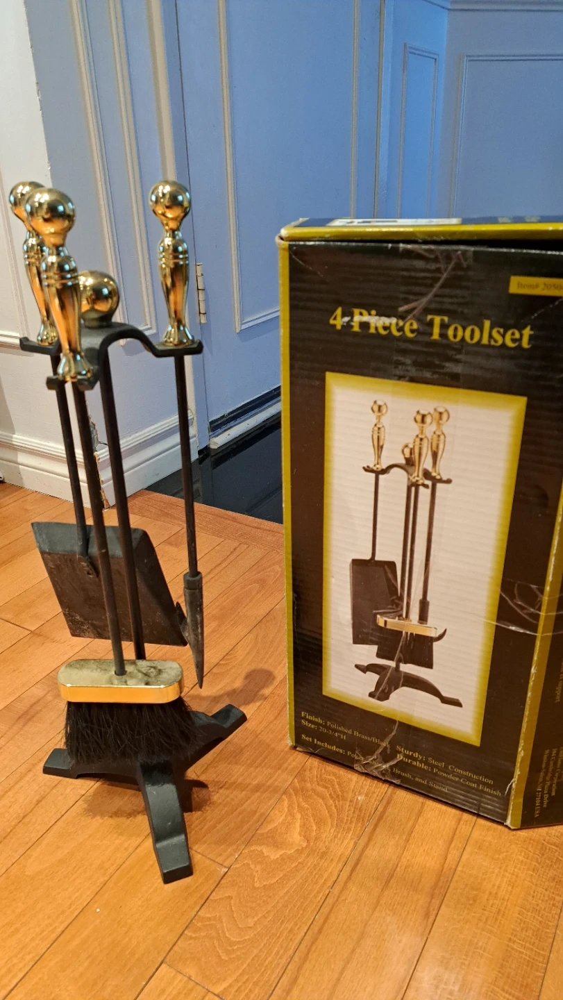 Selling a 4-piece fireplace toolset! It features a polished brass and black finish. The set includes a poker, brush, shovel, and stand. The tools are made with a sturdy steel construction and a durable powder coat finish. It comes with the original box!
