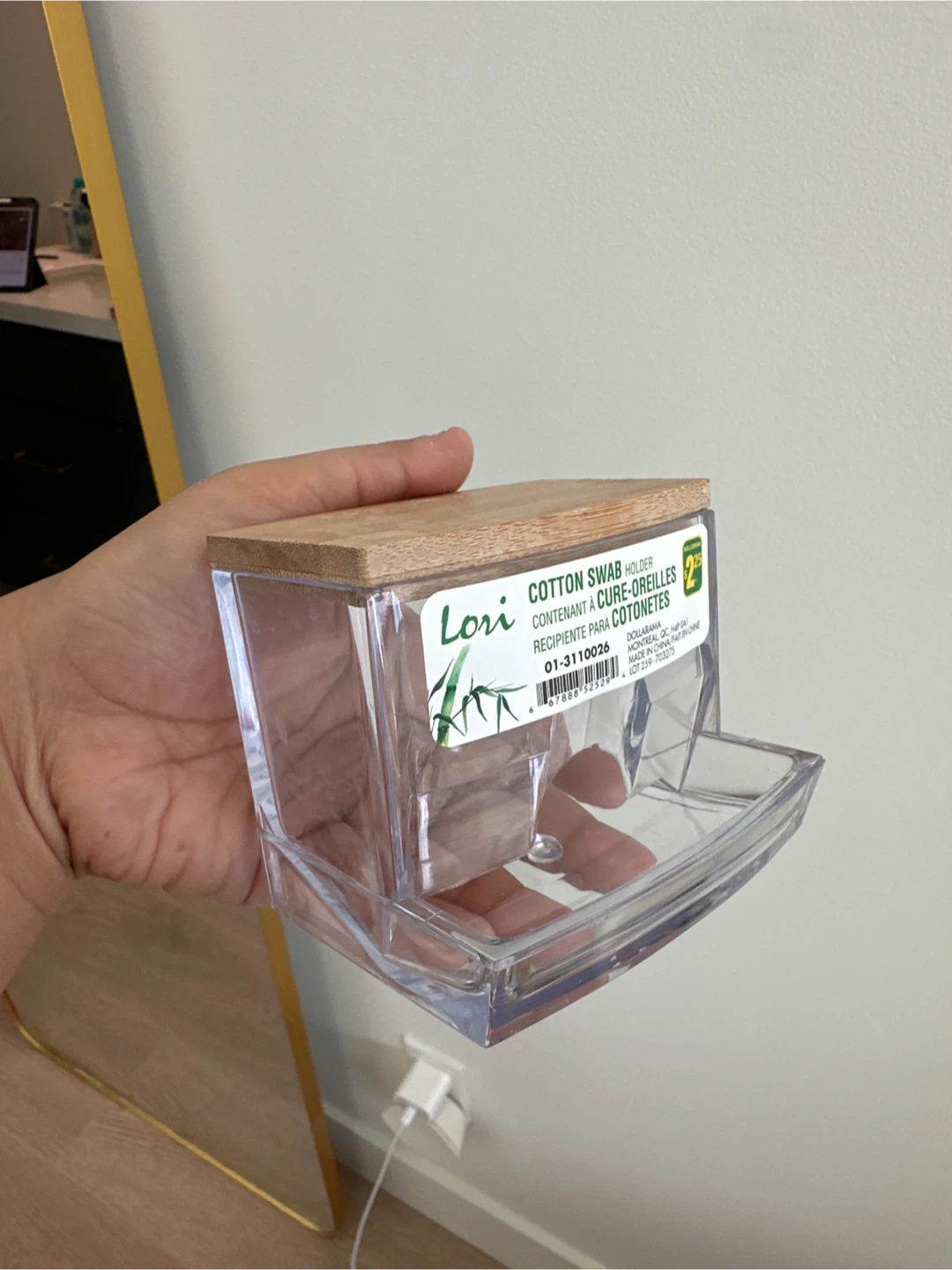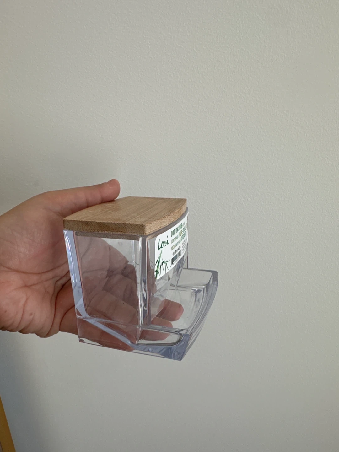 This Lori cotton swab holder features a clear acrylic container with a bamboo lid. It's designed for easy dispensing. Perfect for keeping your bathroom counter tidy!