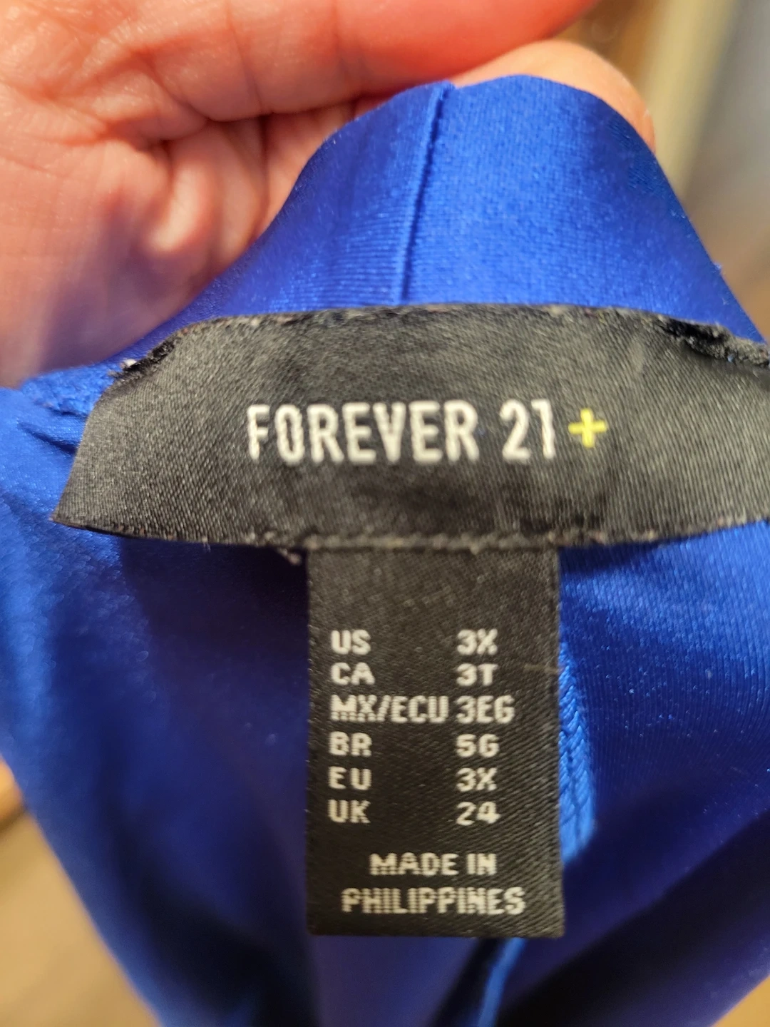 This is a vibrant blue strapless bodycon dress from Forever 21+. It's a size 3X and made in the Philippines. The material is stretchy and comfortable, perfect for a night out or a casual day!