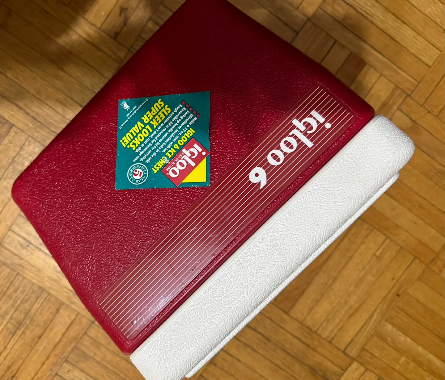 This is an Igloo 6 ice chest cooler in red. It's made of plastic with a white lid. Holds 6 cans with ice.