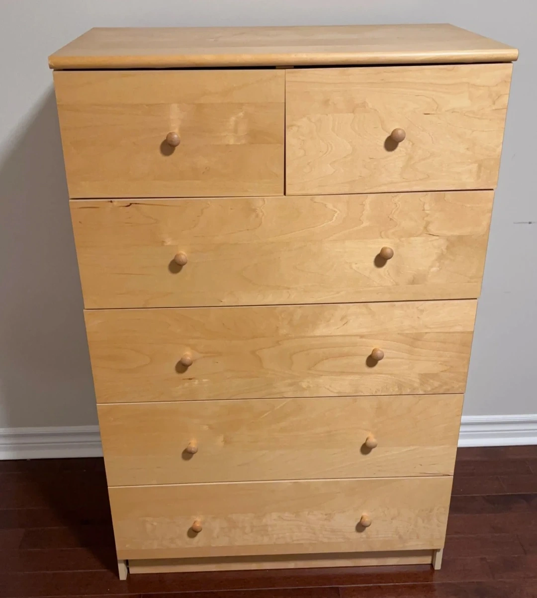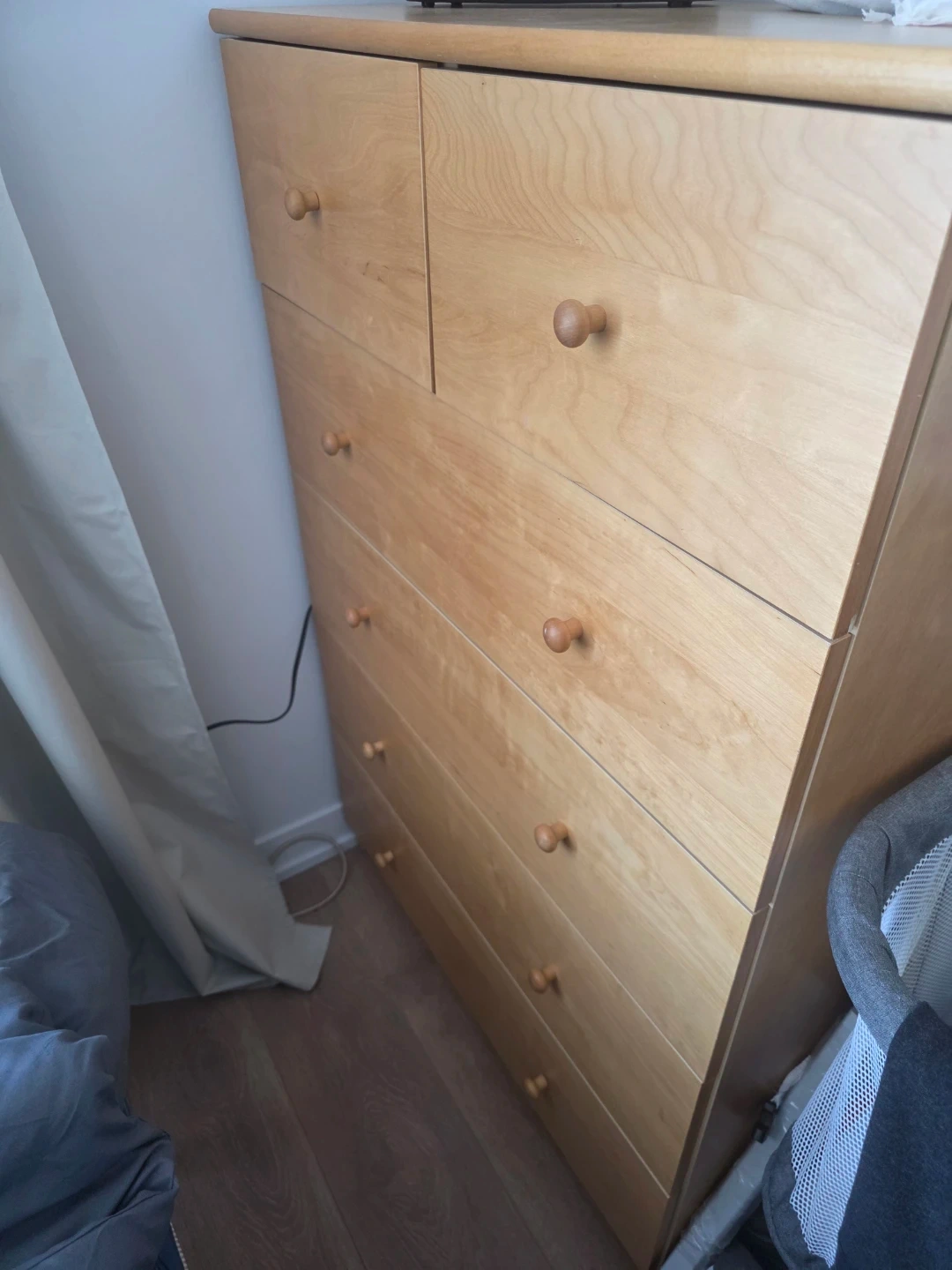This dresser has seven drawers for storage. It's made of light-coloured wood. Perfect for keeping clothes tidy!