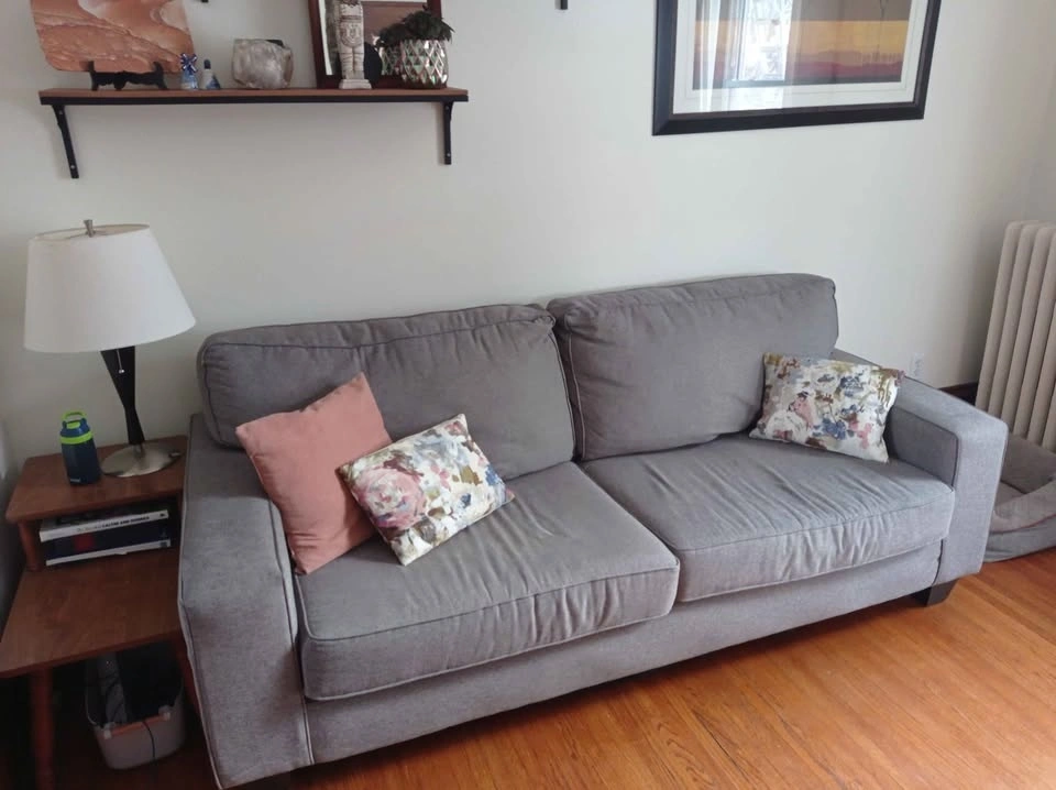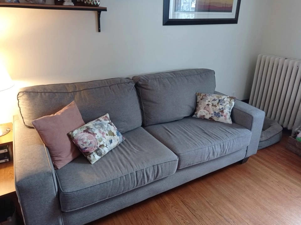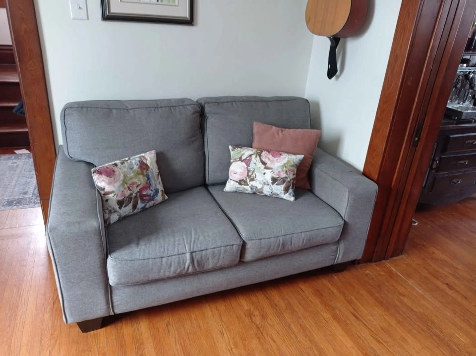 Gray three-seater couch and loveseat for sale. In good condition. Covers from bottom cushions are removable for easy cleaning. Pet friendly home. Throw pillows not included. There is some ripping of the fabric at the bottom of the couch but it's not visible and does not affect function. $300 for both or make an offer for one. Pick up only in East Galt.