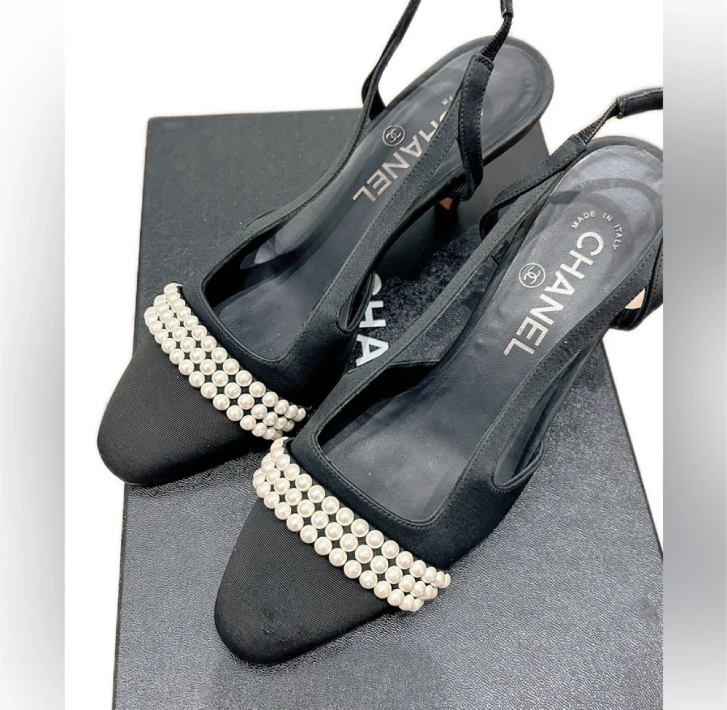 Classic Chanel slingback heels in black fabric. These shoes are adorned with elegant pearl detailing across the toe strap. They're made in Italy and feature the iconic Chanel logo on the heel. Includes original box. Size 36.5.