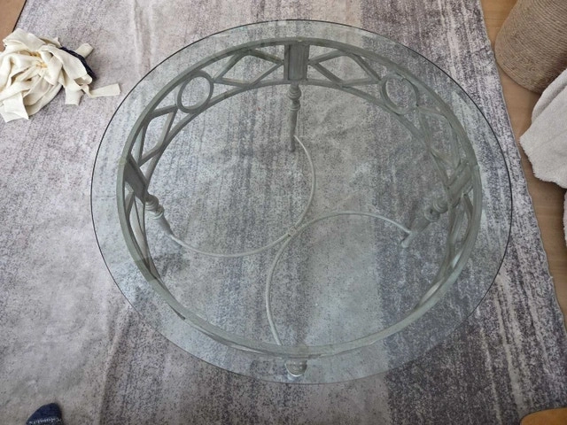 This used round glass table features a sturdy metal base and a clear glass top. The elegant design and durable construction make it a functional and attractive piece. Shape: Round. Material: Glass top with metal base. Condition: Used, with some wear consistent with age. This lovely table is looking for a new home! If the ad is still up, rest assured, it's still available for purchase. I've found similar tables listed on Kijiji for between $75 and $150. I'm asking $110 considering its condition and style. Cashless payment accepted. Cash accepted. For Sale By: Owner.