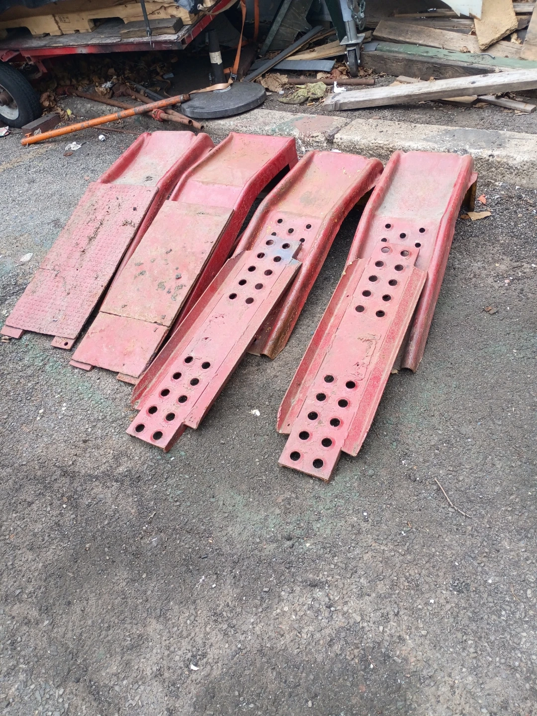 This is a set of five red metal ramps. They appear to be constructed from sturdy steel. Each ramp has a series of circular holes for traction. Used condition with some wear.