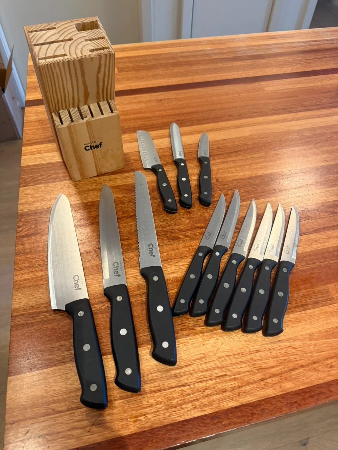 Set of Good chef knives - in good condition Ceramic coffee tumbler - missing lid.
