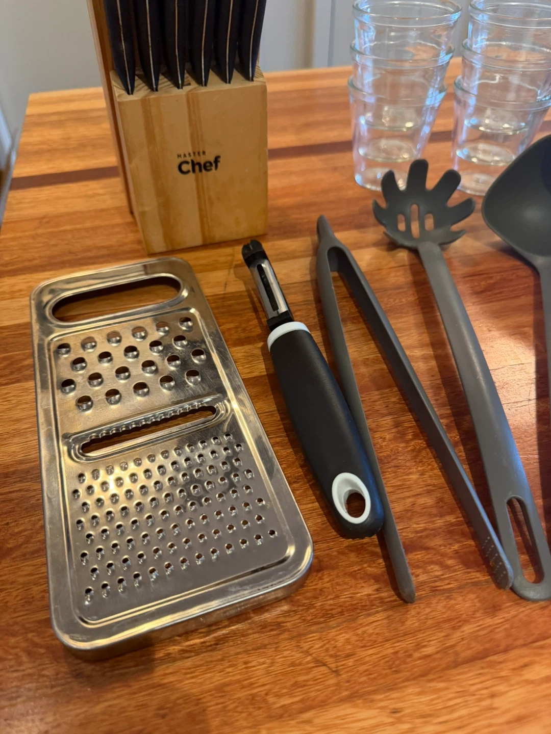 Set of kitchen utensils: peeler, tongs, spaghetti server, ladle, spoon, and spatula.