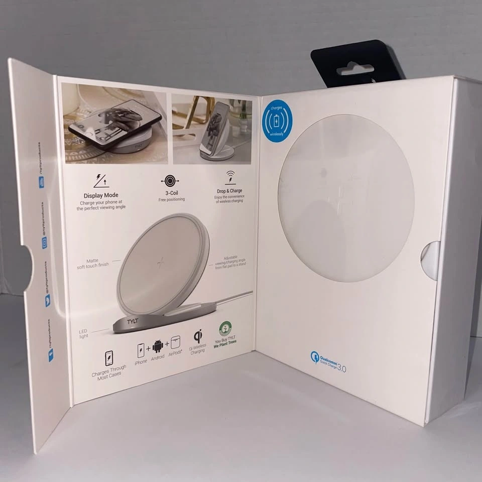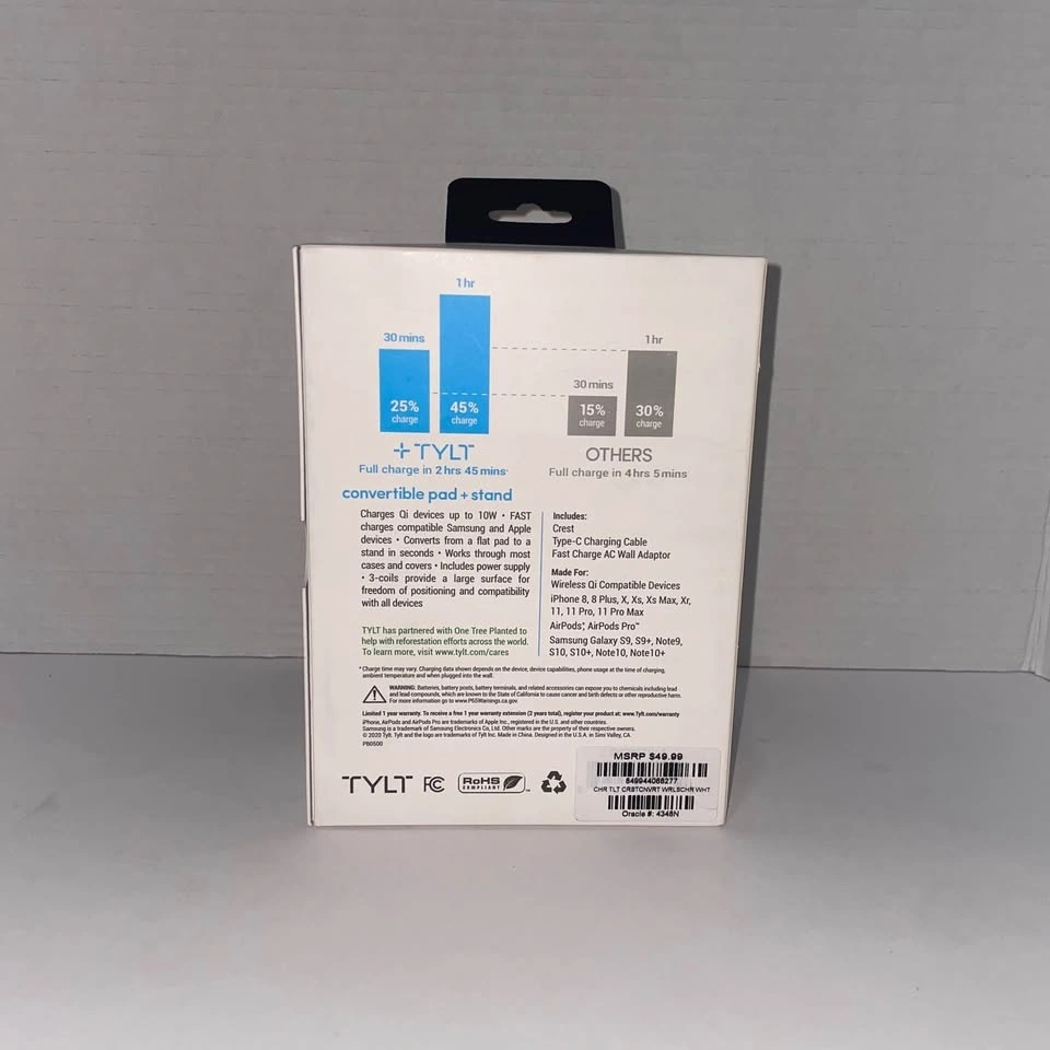 TYLT wireless charger in perfect condition. Convertible pad + stand model, great for charging your phone flat or upright. Fast charging, works through most cases. Very convenient for the office, home, or nightstand. Ready to use, great quality.