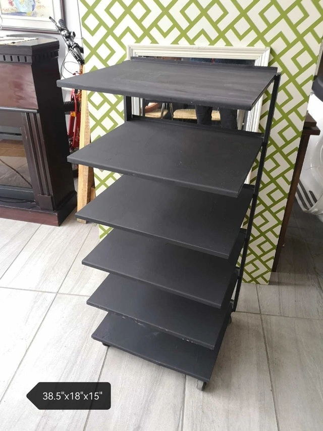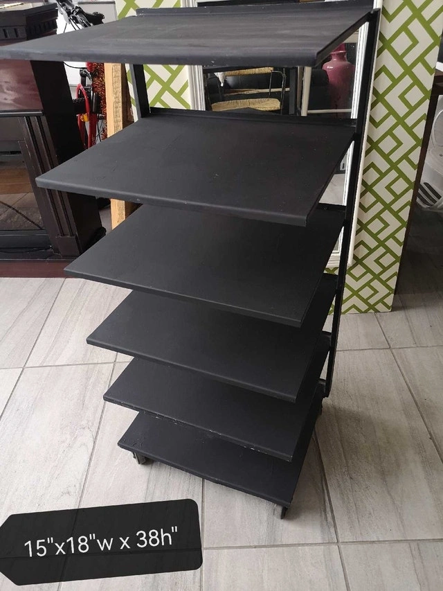 This sturdy, used rolling shelf rack is perfect for adding extra storage to any room. With its six shelves and durable construction, it's ideal for organizing books, tools, or displaying your favourite items. Here are its specifications: