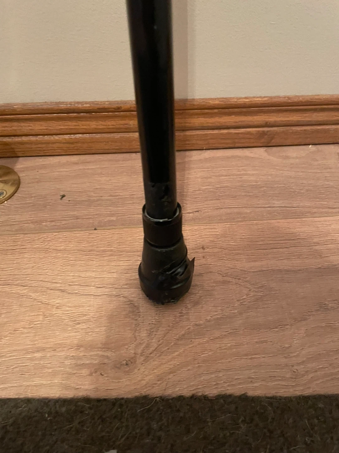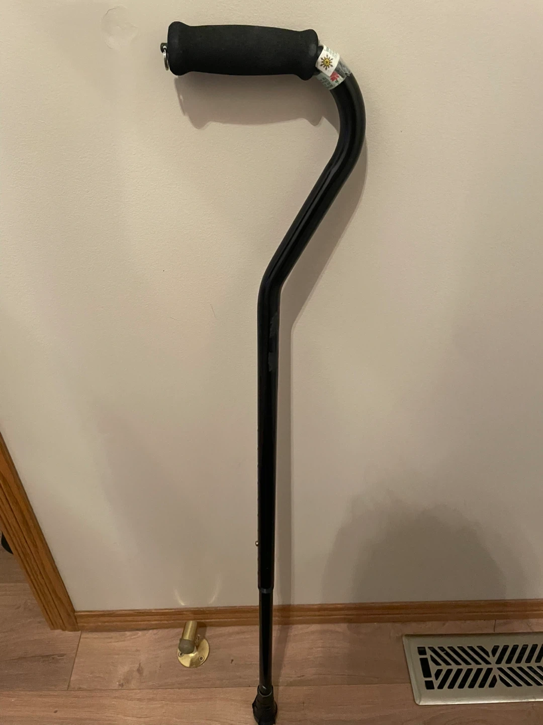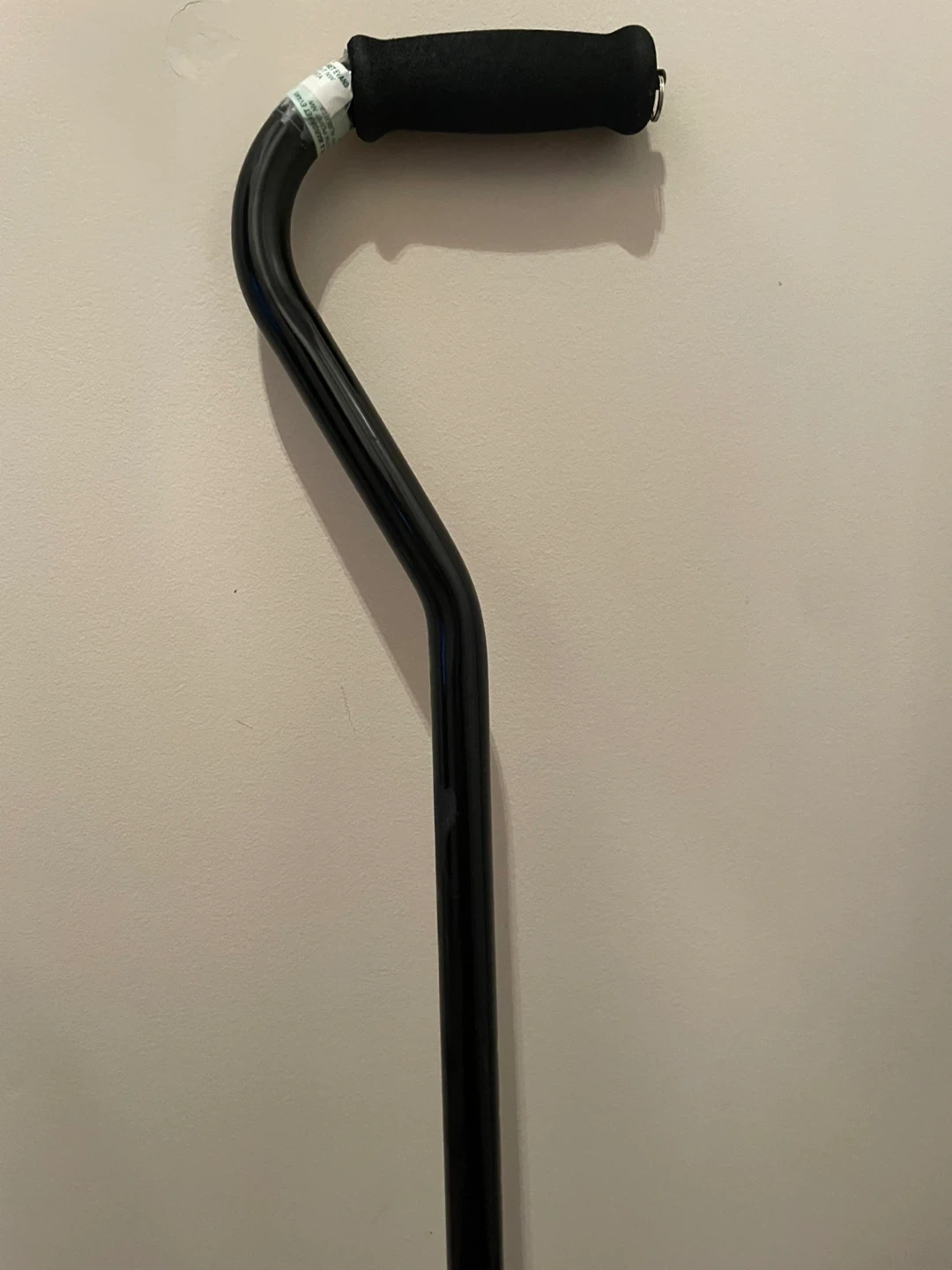 This black walking cane features a comfortable padded handle for easy grip. It's adjustable in height, suitable for most users. The rubber tip provides stability and traction. This cane offers reliable support for mobility assistance.