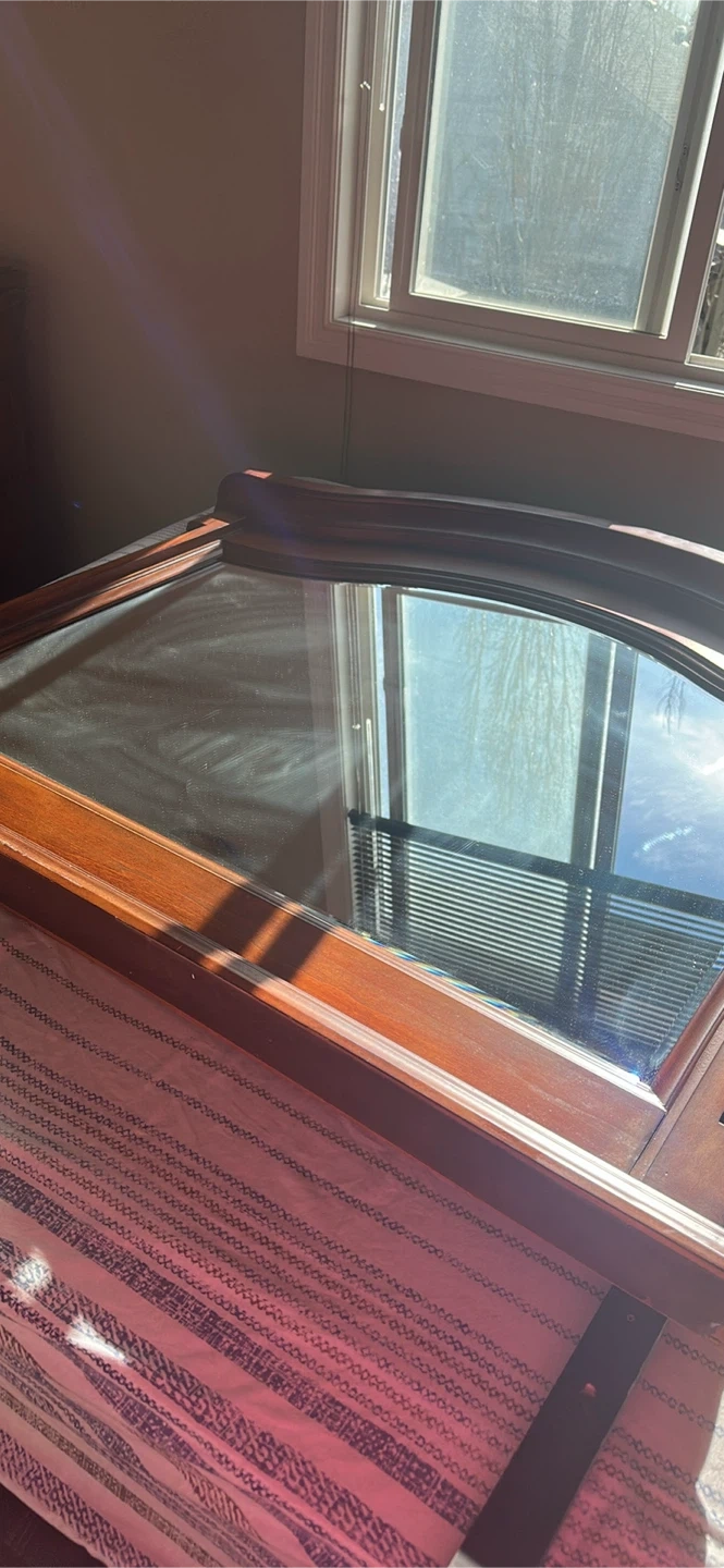 This classic curio cabinet features a rich wooden frame and a glass door. It's perfect for displaying collectibles or decorative items. The cabinet has a traditional design with curved top detailing.