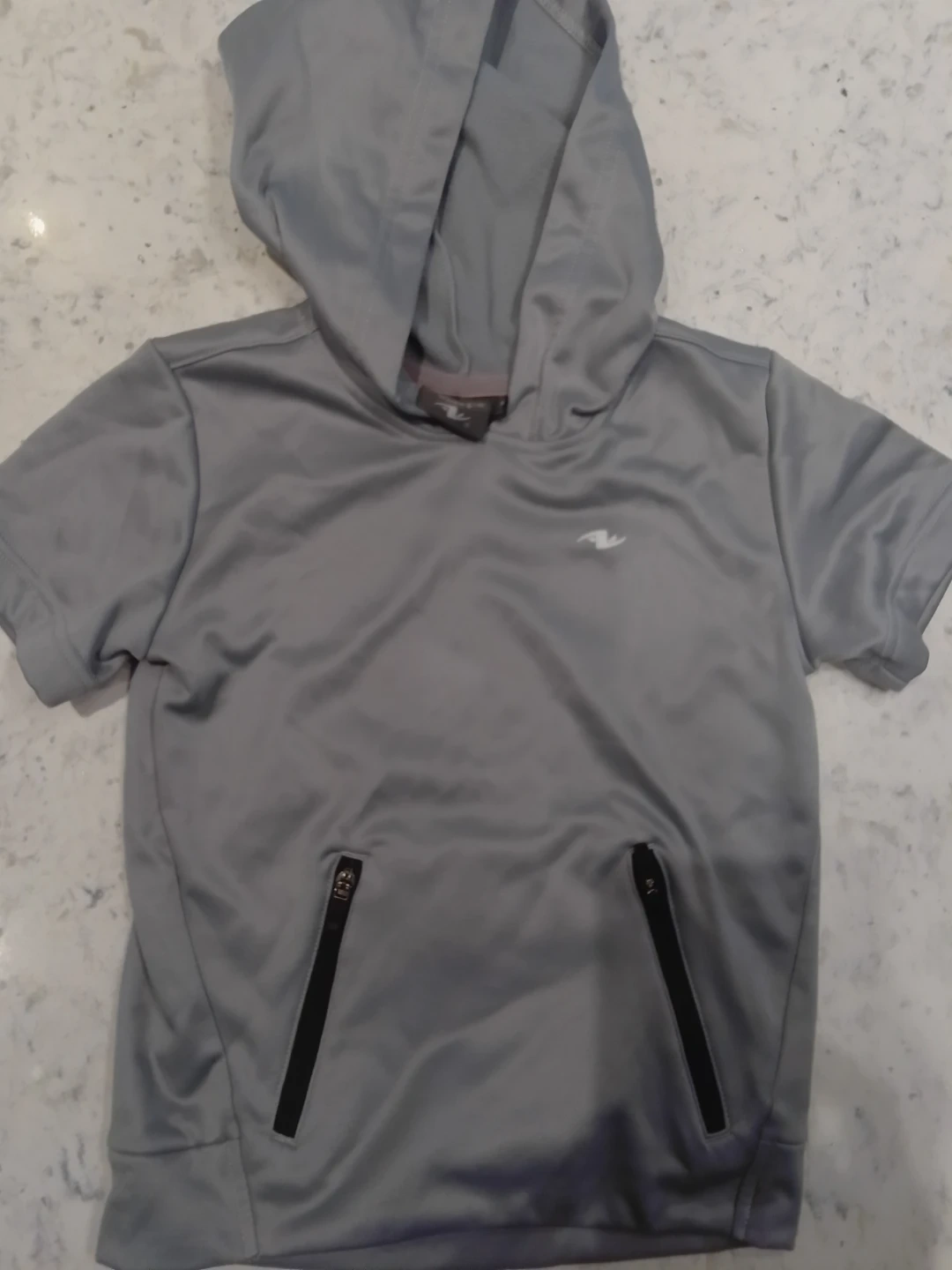 Grey short sleeve hoodie with two zippered front pockets. It's made of a performance fabric. Great for active kids!