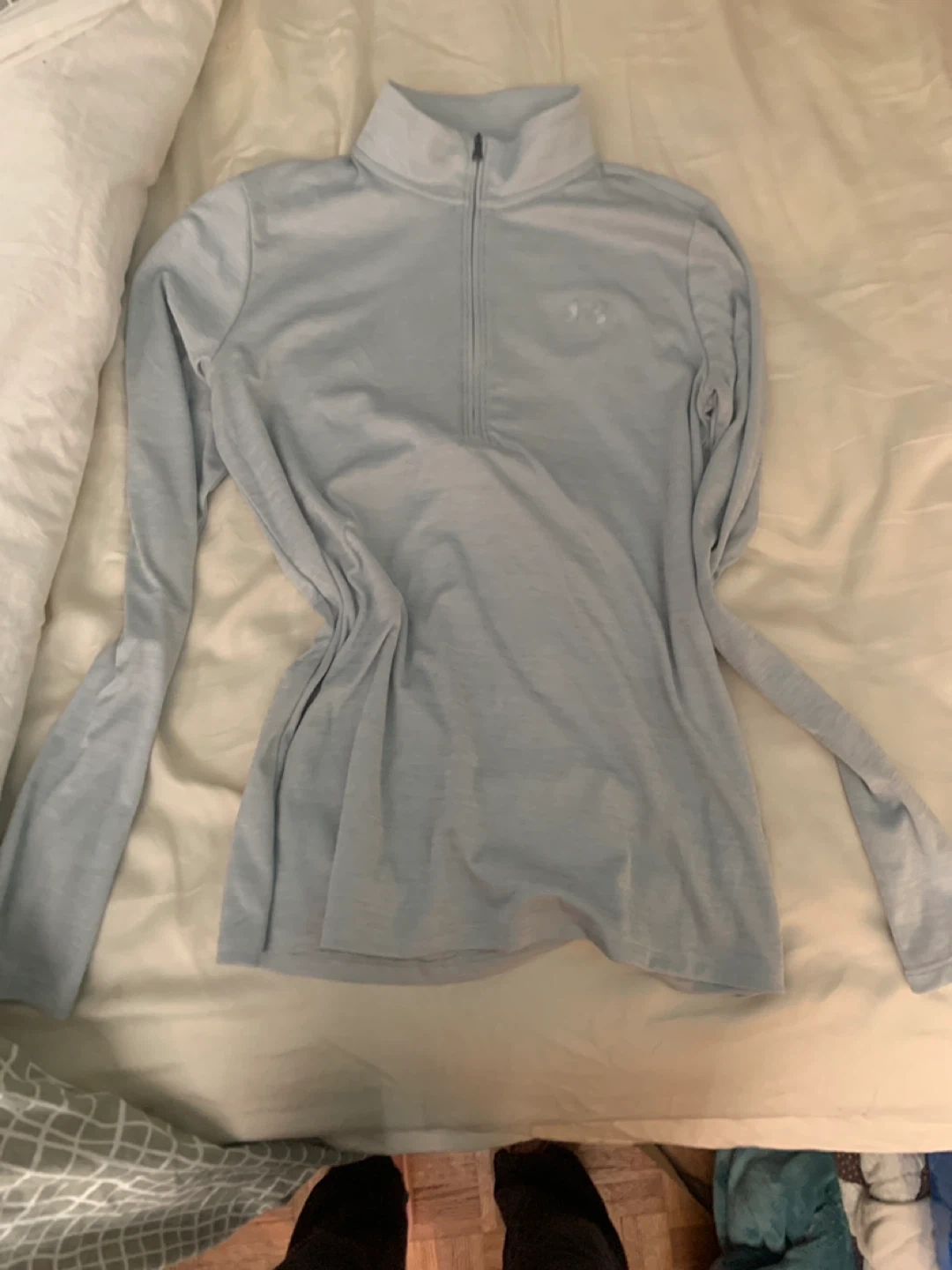 This light blue Under Armour long-sleeved shirt features a 1/4 zip neckline. It's made from a breathable fabric, perfect for workouts or casual wear. The shirt has a comfortable fit.