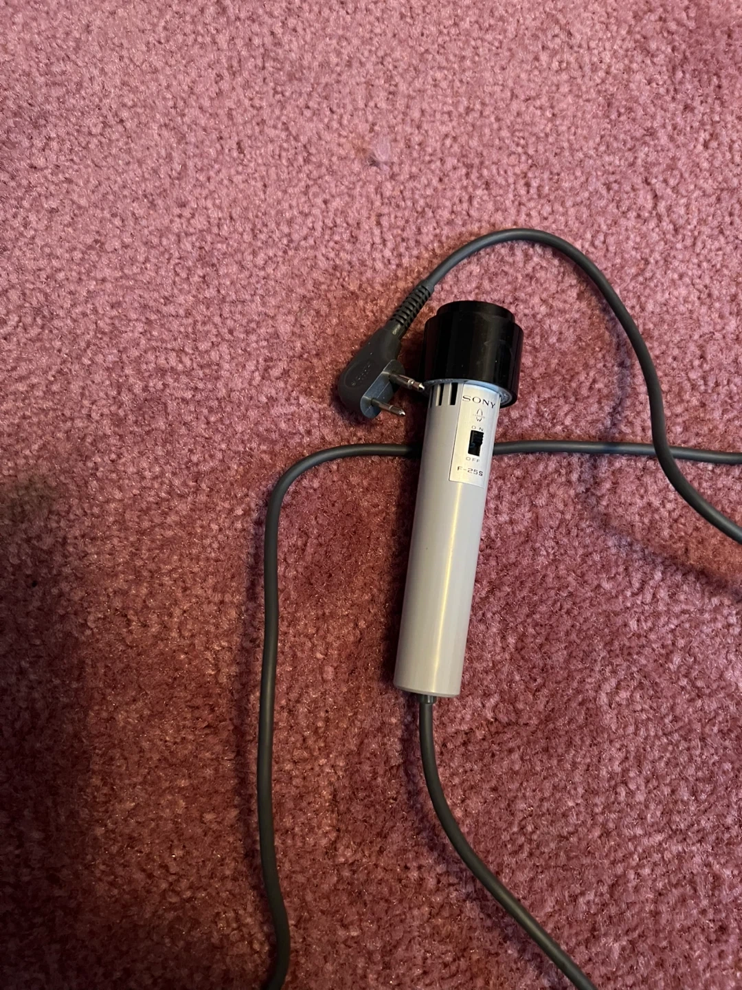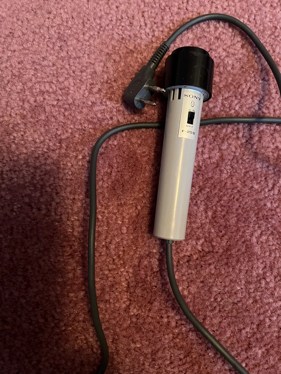 It's a vintage Sony F-25S microphone. It has a f-25s model number visible. The microphone is grey and black.