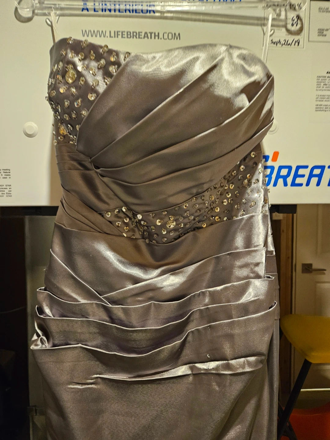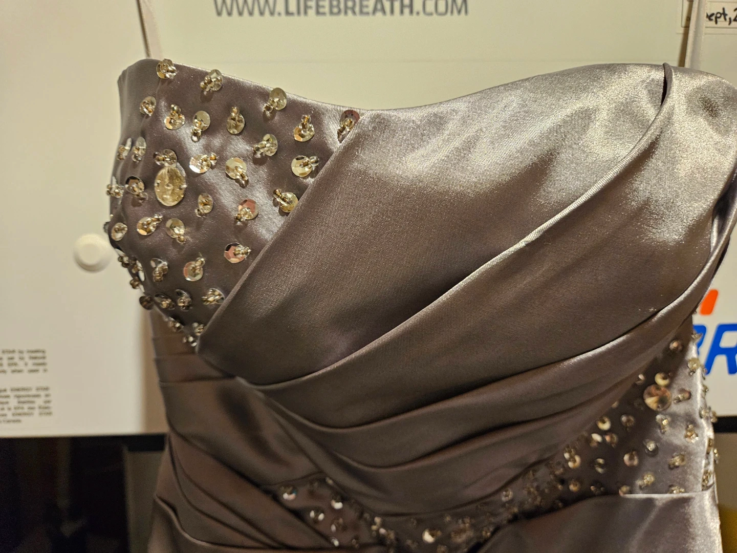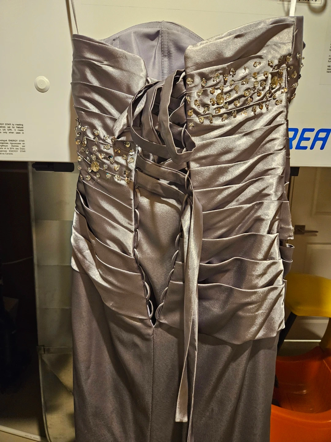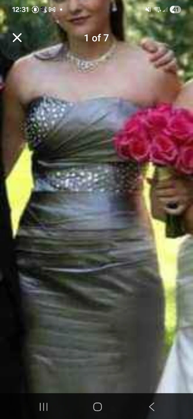 A strapless evening gown in a shimmering silver satin fabric. Features intricate beading and sequins on the bodice and waistline. The back has a lace-up closure for an adjustable fit.