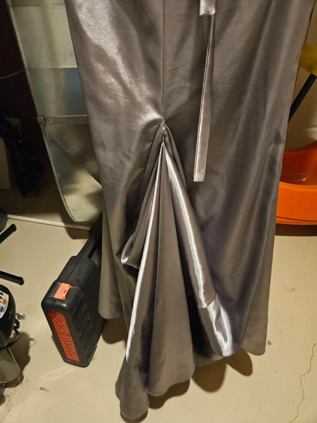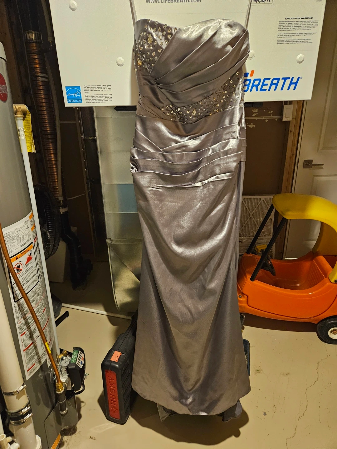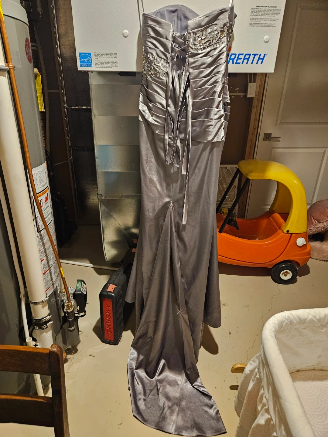 A strapless evening gown in a shimmering silver satin fabric. Features intricate beading and sequins on the bodice and waistline. The back has a lace-up closure for an adjustable fit.