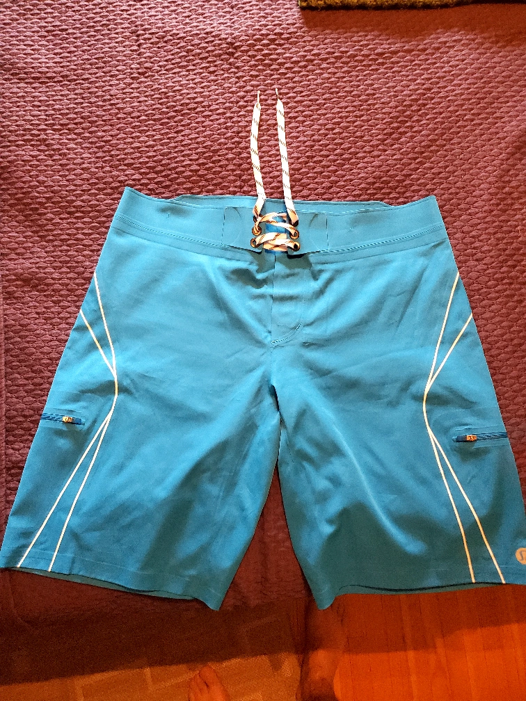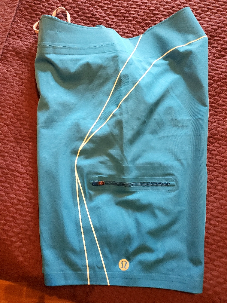Here are some Lululemon board shorts in great condition! They are a size 36 and feature a cool teal colour with white accents. Perfect for swimming or just hanging out