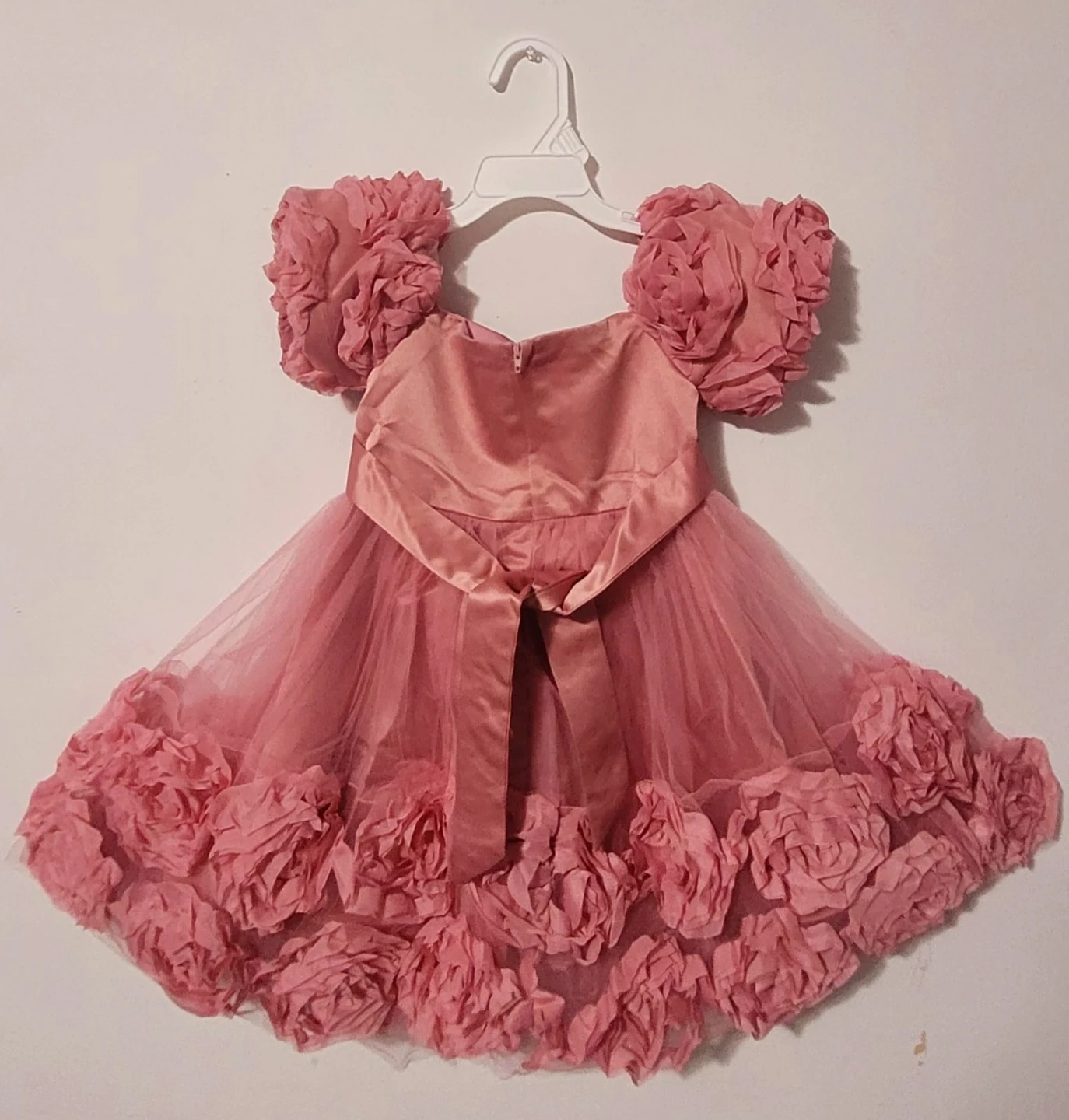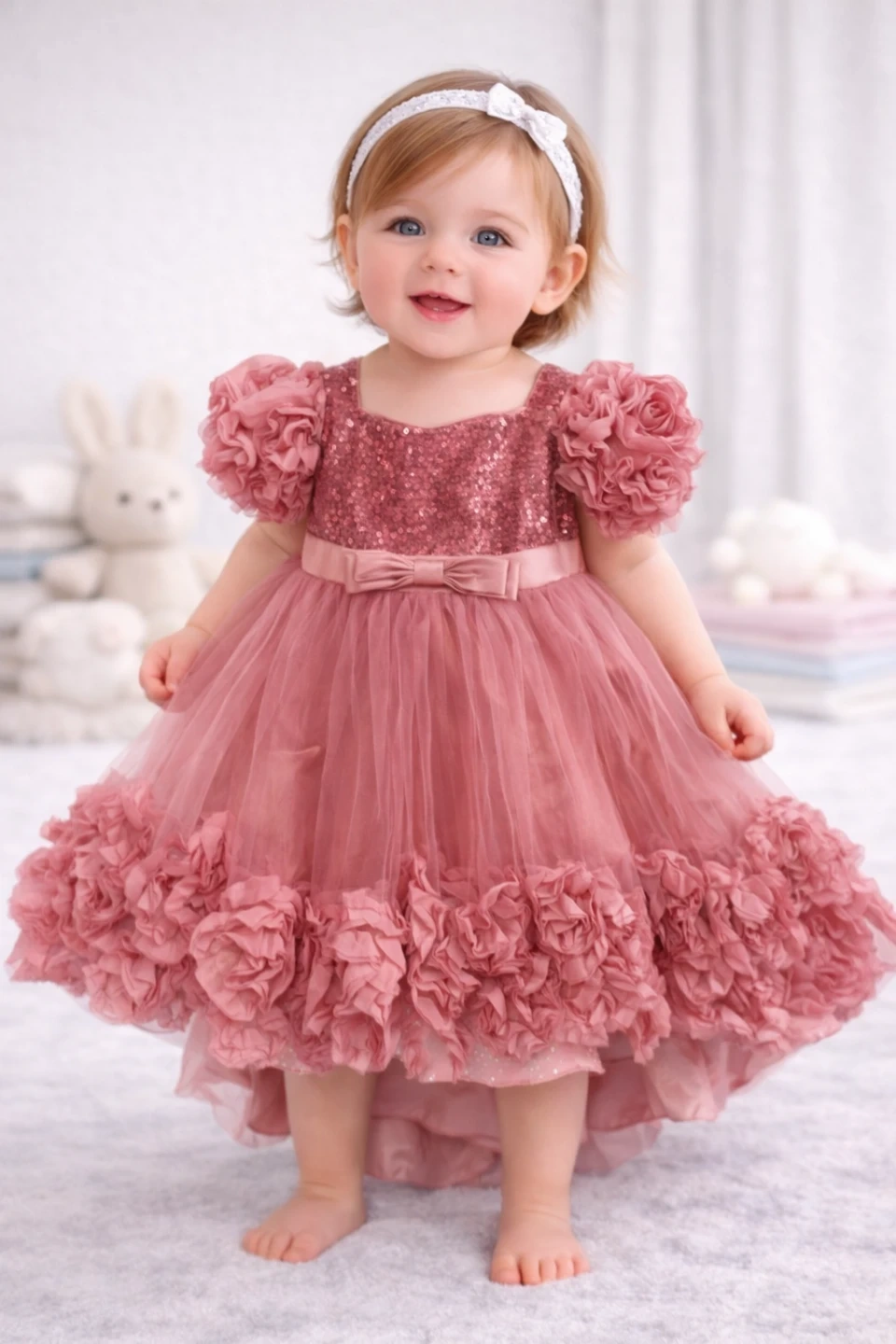 Adorable pink baby dress with sequin bodice and fluffy rose-petal skirt. It has puff sleeves and a satin bow accent. Perfect for special occasions or photoshoots!