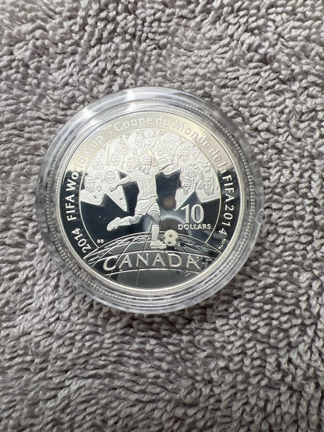 Here's a 2014 FIFA World Cup fine silver $10 coin, a fantastic collectible featuring a soccer theme! Specifications: * Composition: 99.99% Pure Silver * Diameter: 34 mm * Weight: 15.87 grams * Obverse: Effigy of Her Majesty Queen Elizabeth II by Susanna Blunt * Reverse: A child playing soccer, designed by Greg Banning. Condition: Used - Good. For Sale By: Owner. Cash accepted.