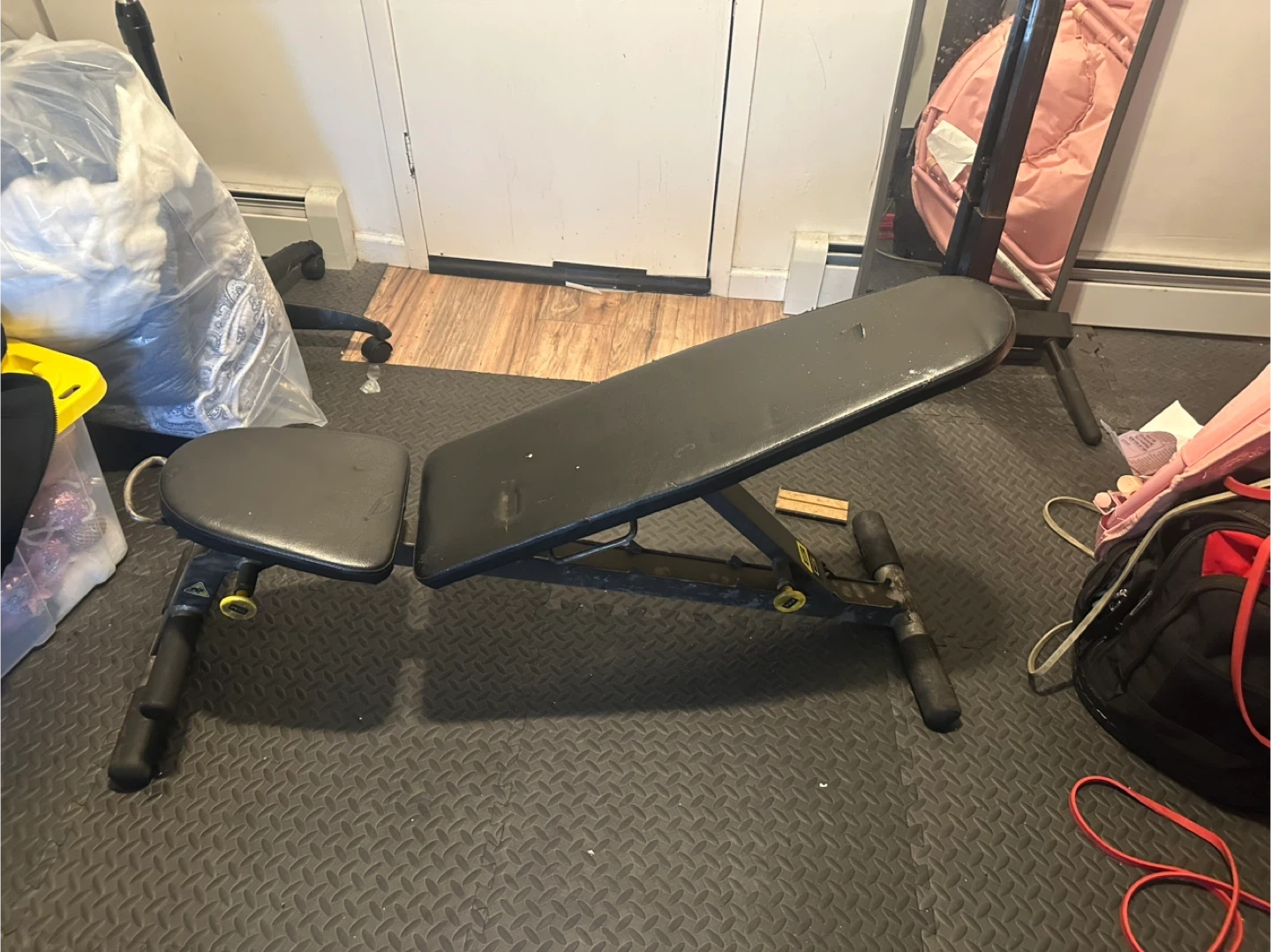 This is a Body-Solid adjustable weight bench. It's great for various workout routines. The bench is upholstered in black vinyl and has a sturdy metal frame. Note slight tear upper padding, but does not affect bench performance.