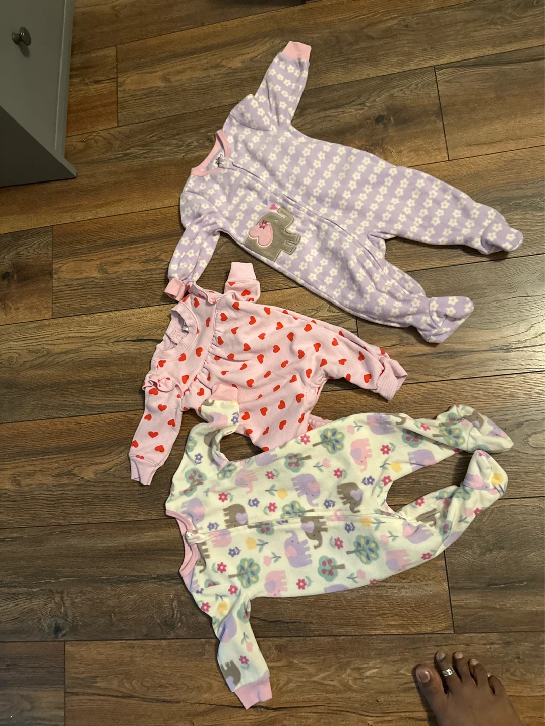 Three footed baby sleepers in various cute prints. Includes one purple floral with elephant applique, one pink with red hearts, and one cream with elephants and trees. Zipper closures for easy dressing. Cotton blend material.