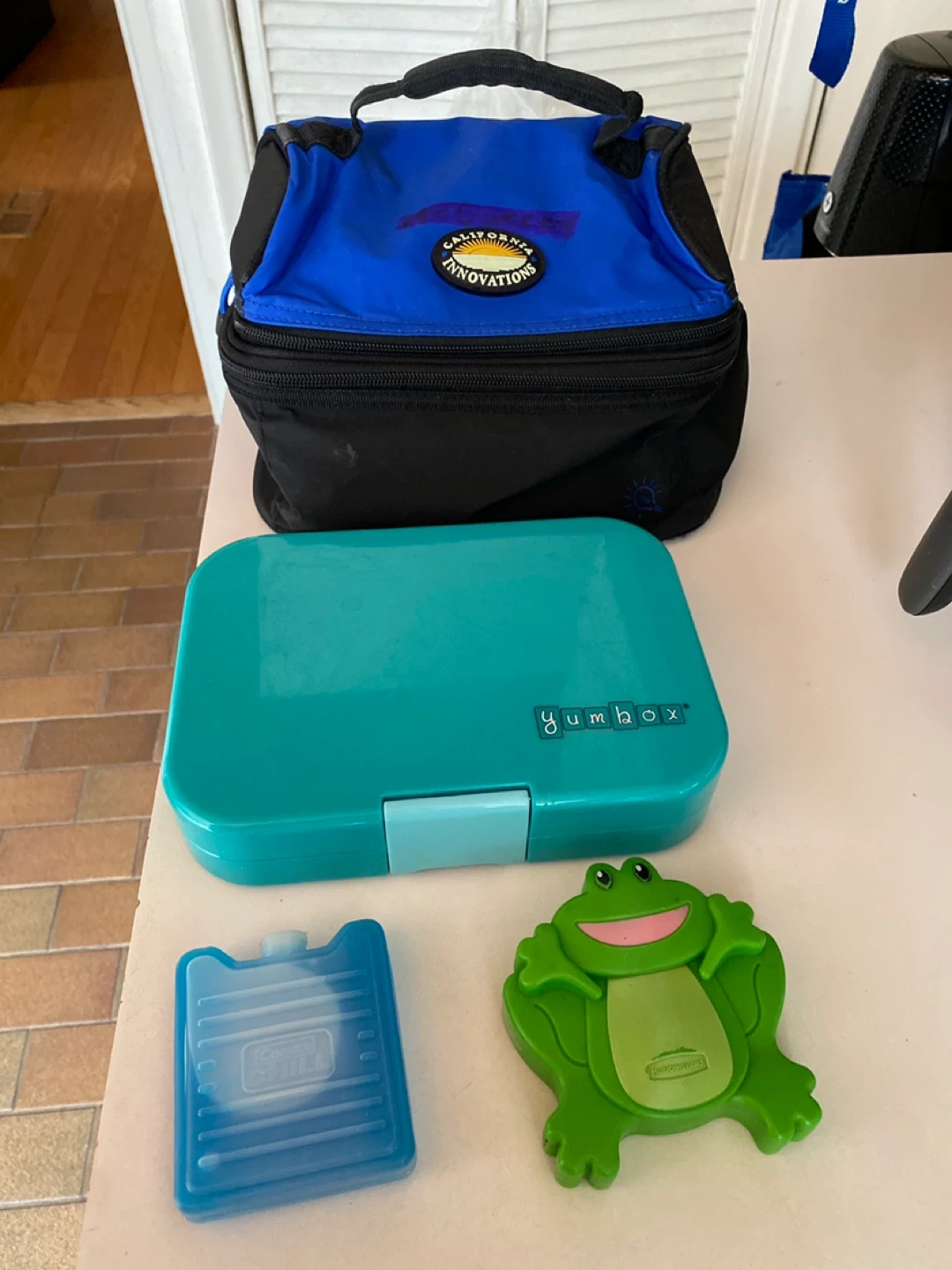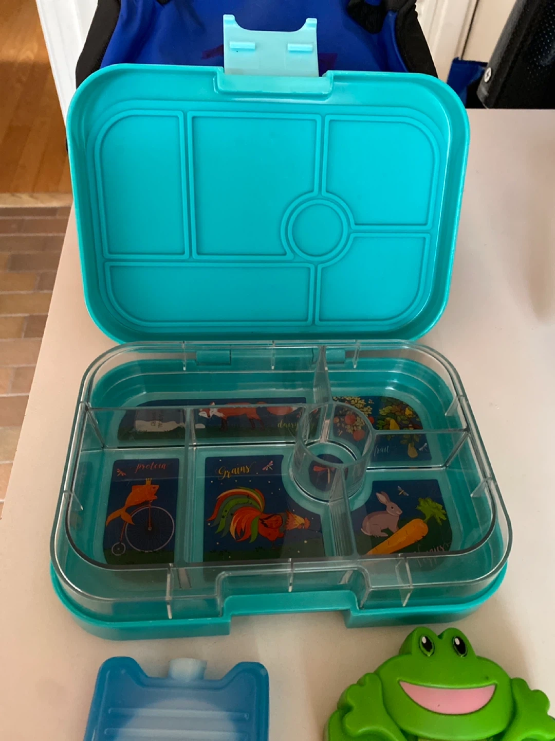This Yumbox lunch box comes with a teal bento box and a blue insulated bag. It also includes a small ice pack and a cute frog-shaped ice pack. The bento box has multiple compartments for separating food. These bento boxes cost $60 new!