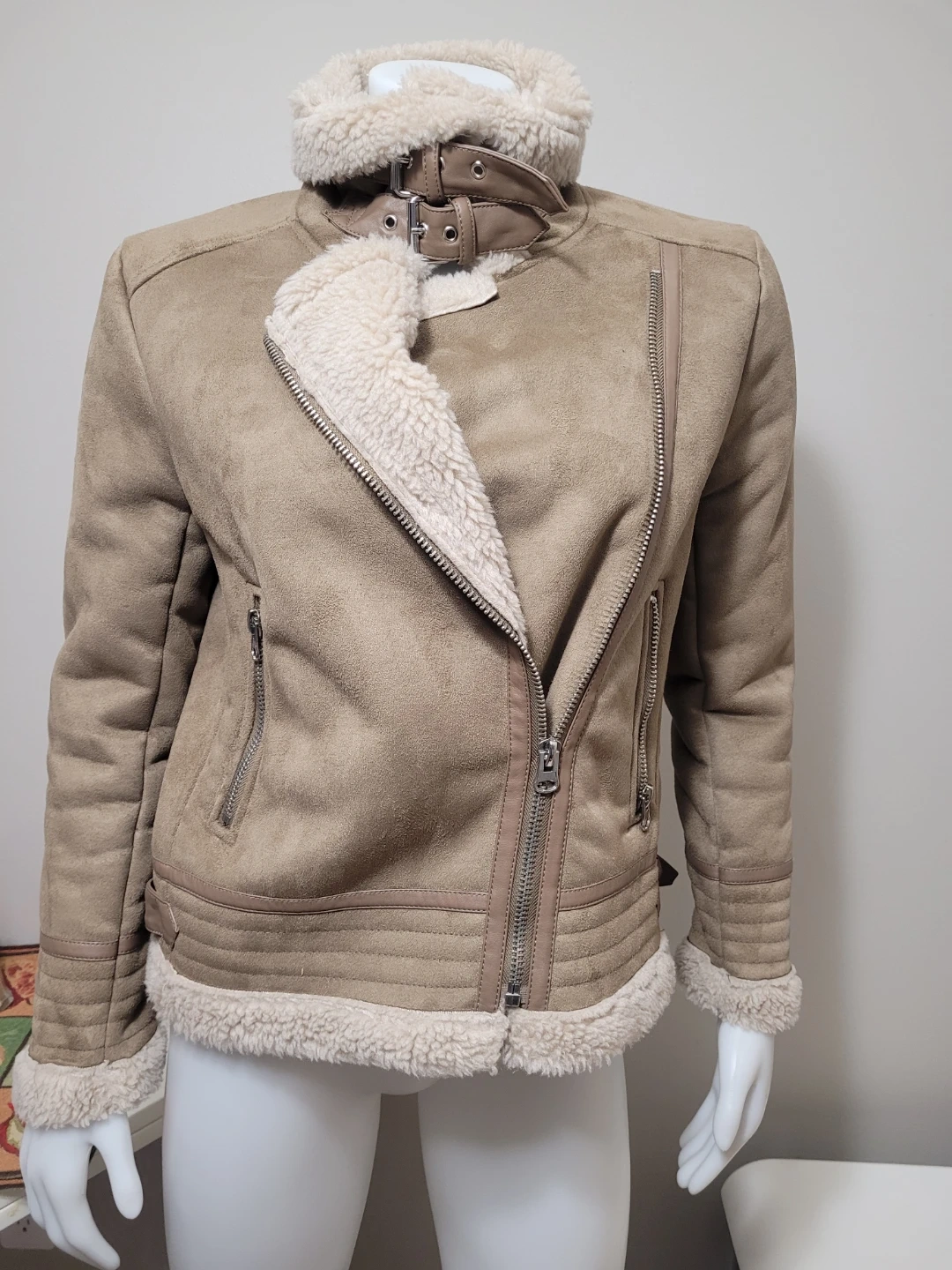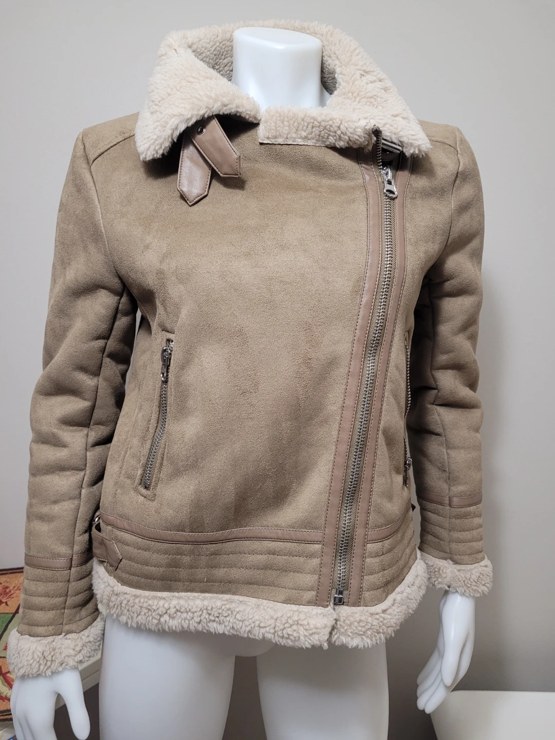 This stylish tan moto jacket features a soft faux suede exterior with cozy shearling lining. It has an asymmetrical zip closure and two zippered pockets. It's a great layering piece for cooler weather!