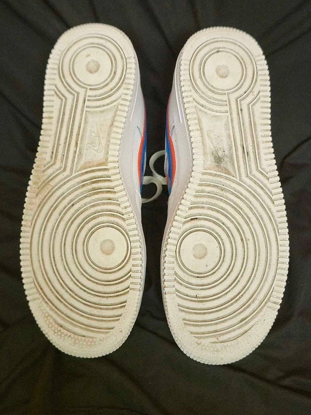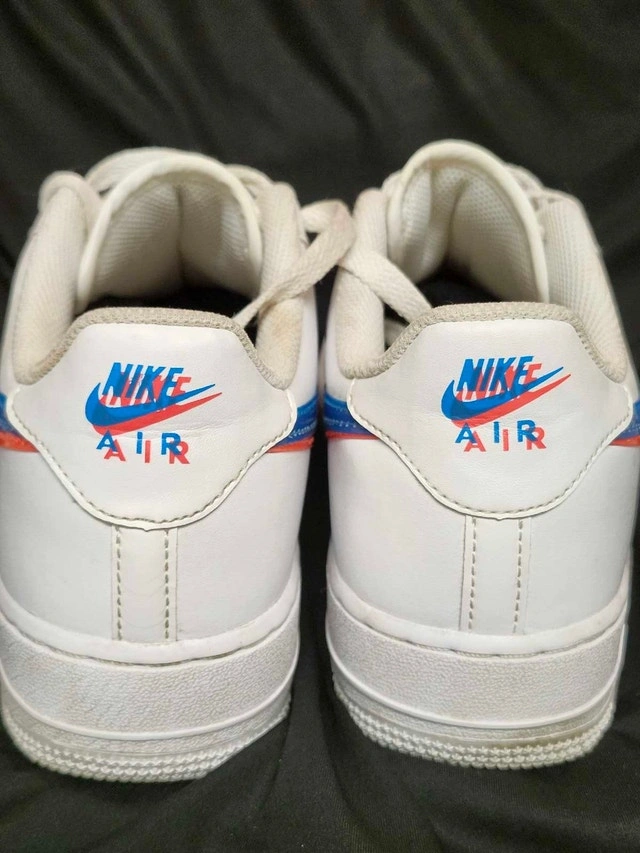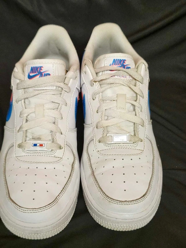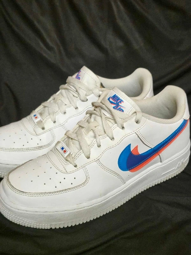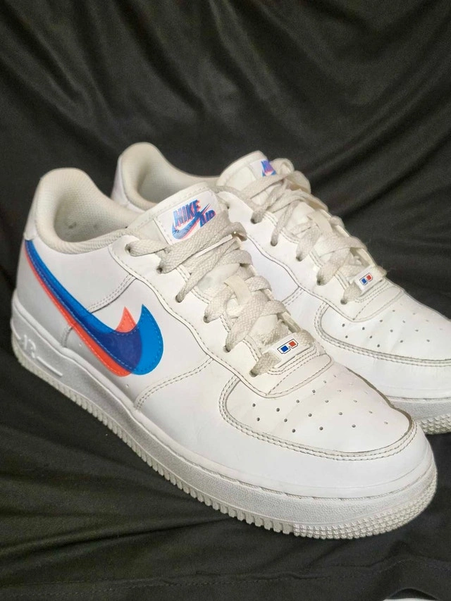 Used Nike Air Force 1 sneakers in youth size 7, featuring a unique 3D glasses design with red and blue accents. These shoes have been worn and the condition reflects that, as you can see from the photos provided. Brand: Nike, Model: Air Force 1, Size: Youth 7, Colour: White with red and blue accents. Based on recent Kijiji listings, similar youth Nike Air Force 1s sell for between $40 and $70. Given the condition, I've priced them at $45. If you're seeing this ad, the shoes are still available, ready to add a bit of fun to someone's wardrobe!