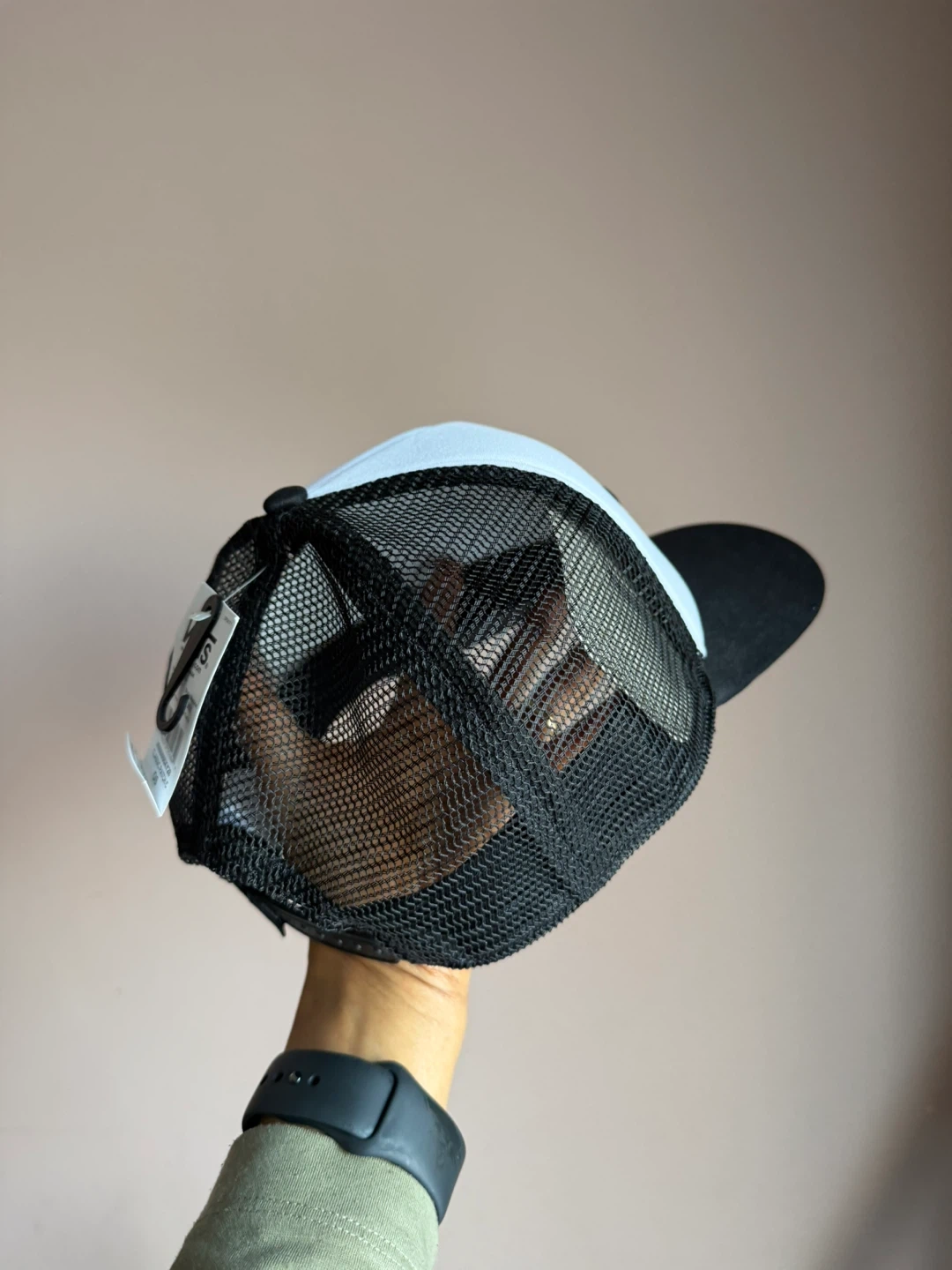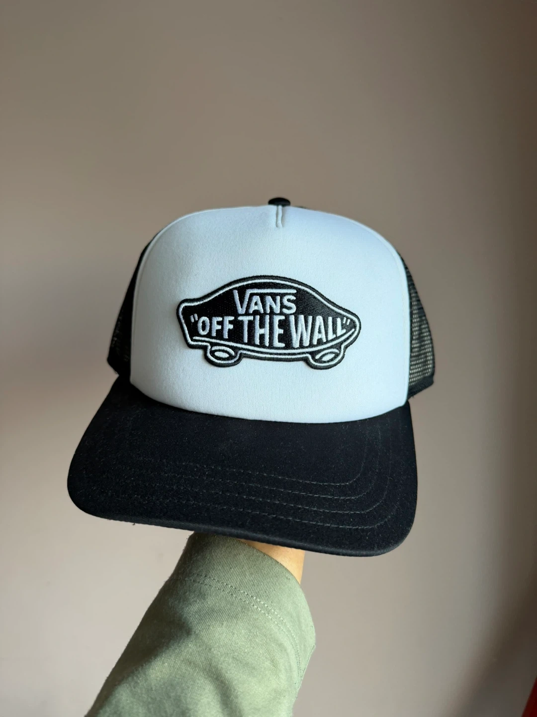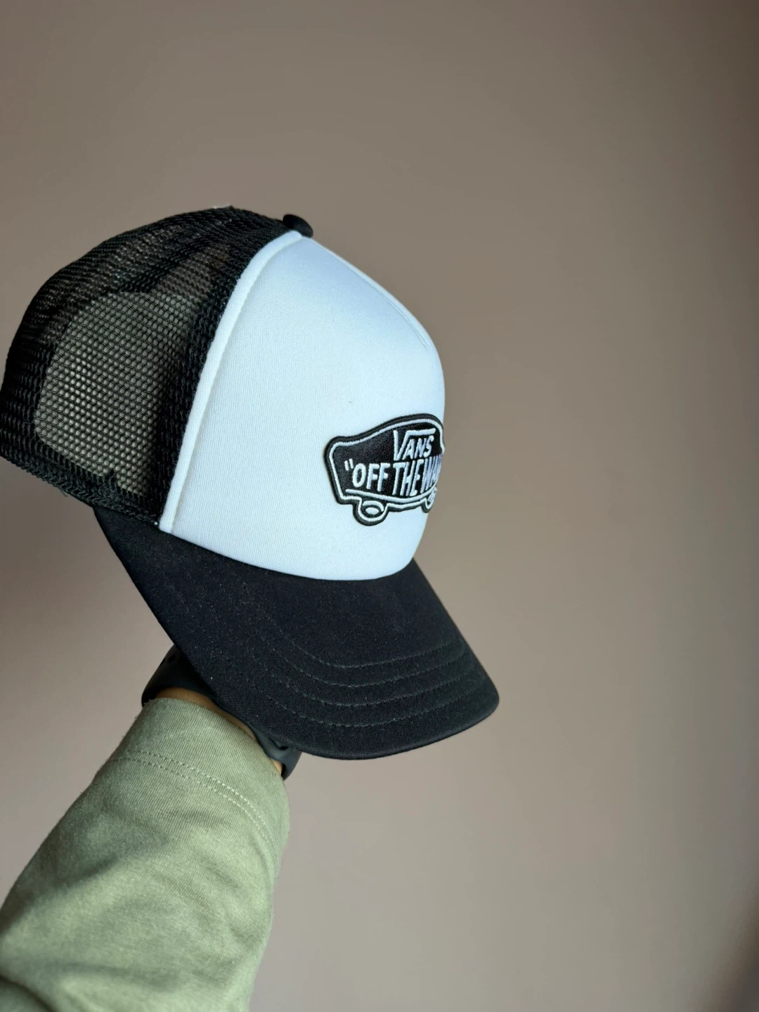 This is a Vans trucker hat. It's black and white with a mesh back. The iconic Vans 'Off The Wall' logo is featured on the front.