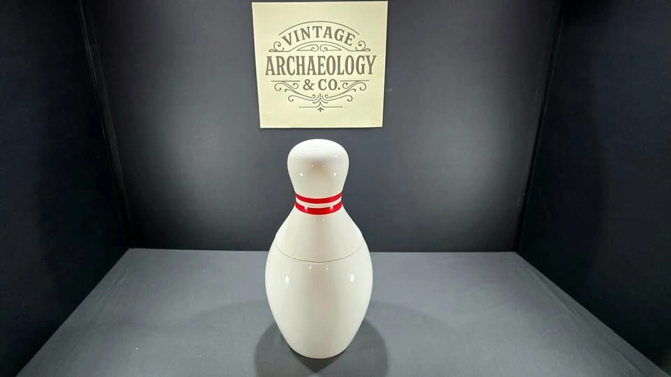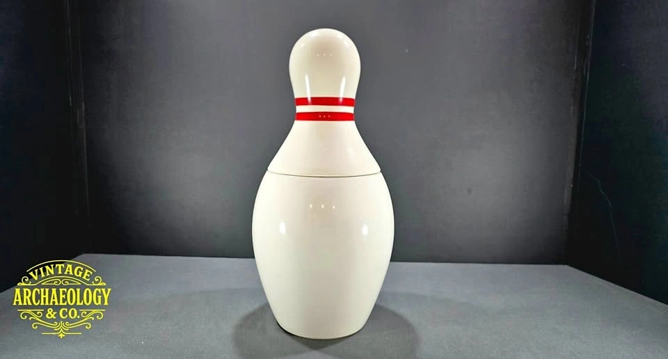 Strike up some vintage charm with this ceramic bowling pin cookie jar, a playful and eye-catching piece that brings personality to any kitchen or collection.