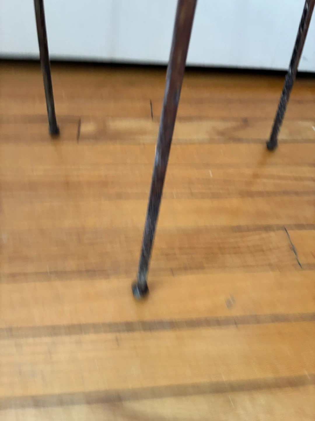 Likely brass originally or gold toned wrought iron but now nice patination and some light rust on base legs