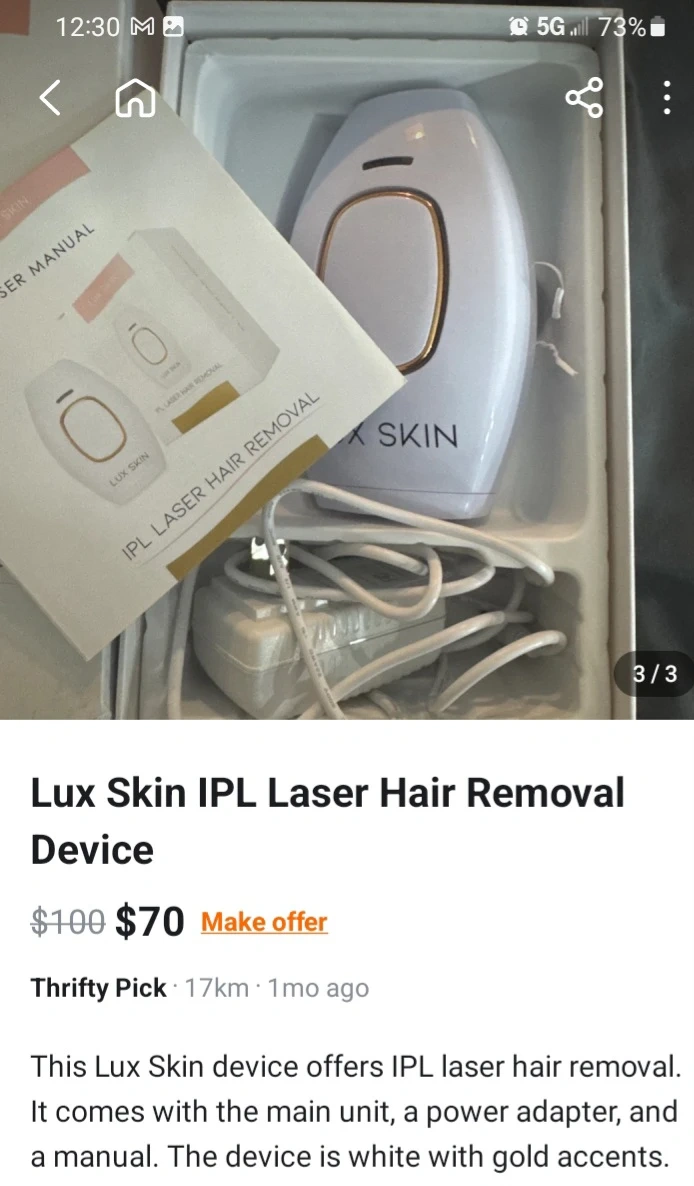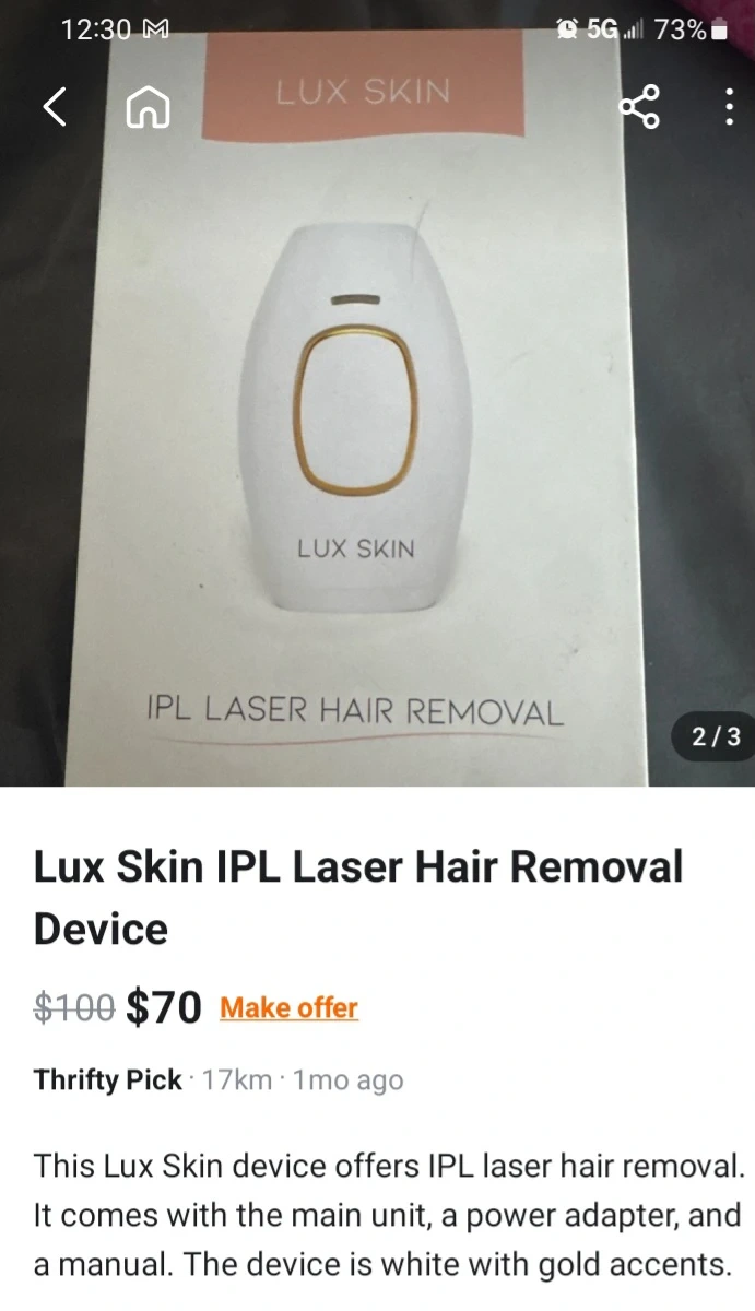 Selling a Lux Skin IPL hair removal device. It comes with the plug in device. It is designed for at-home use and helps reduce hair growth over time. It has been used 2-3 times and works exceptionally well.With a real plug.. it charges faster than with new charger systems! 2 photos show what it looked like in packageand sold for new $100 plus tax, $113. It is ready for a new home. Karrot suggests $55 - 65.