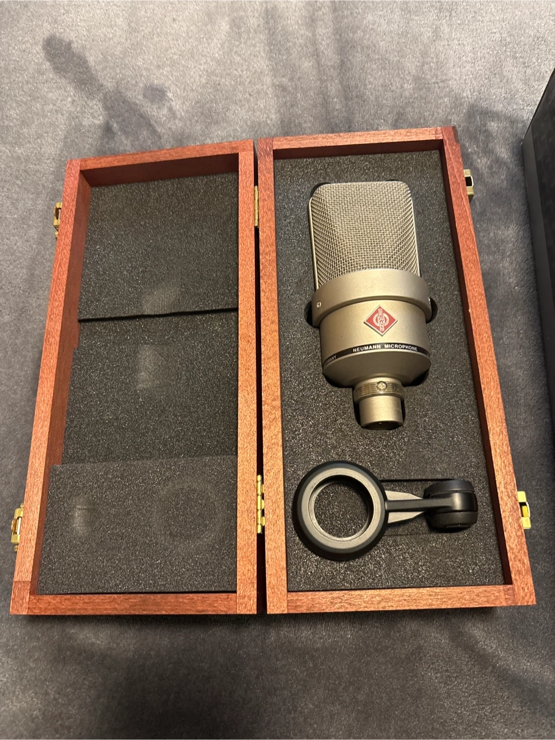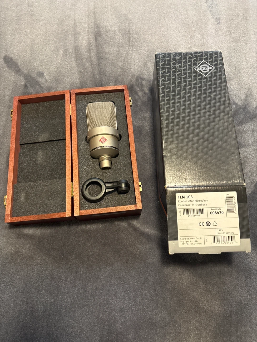 This is a Neumann TLM 103 condenser microphone. It's designed for studio use and comes with its original wooden case and shock mount. Includes the original box too!