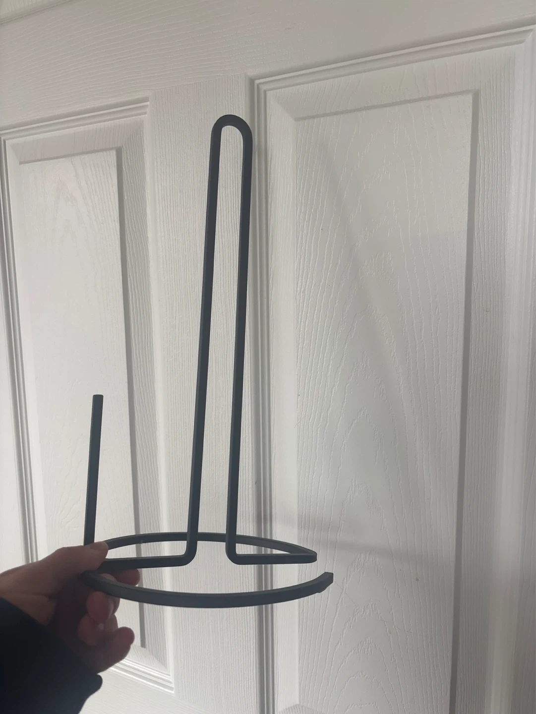 This is a simple dark grey metal paper towel holder. Its sleek design makes it a practical addition to any kitchen. It's designed to hold a standard roll of paper towels.