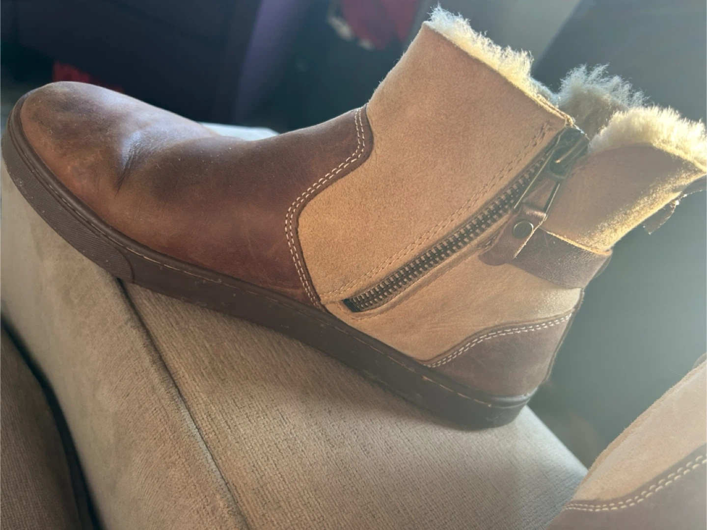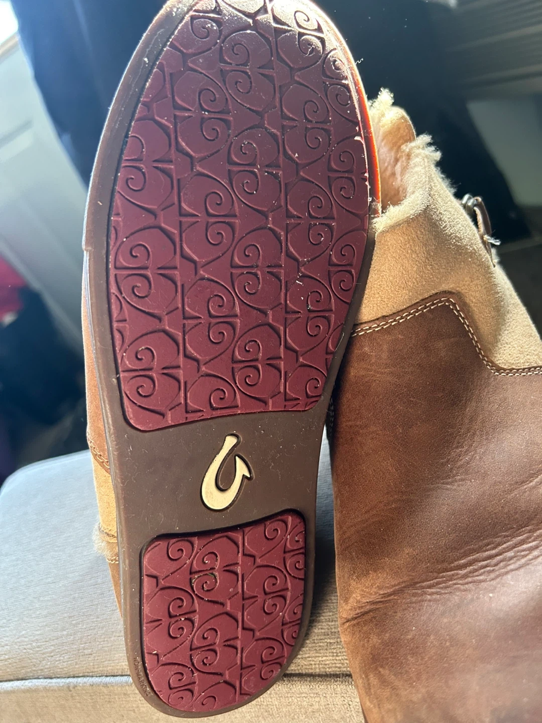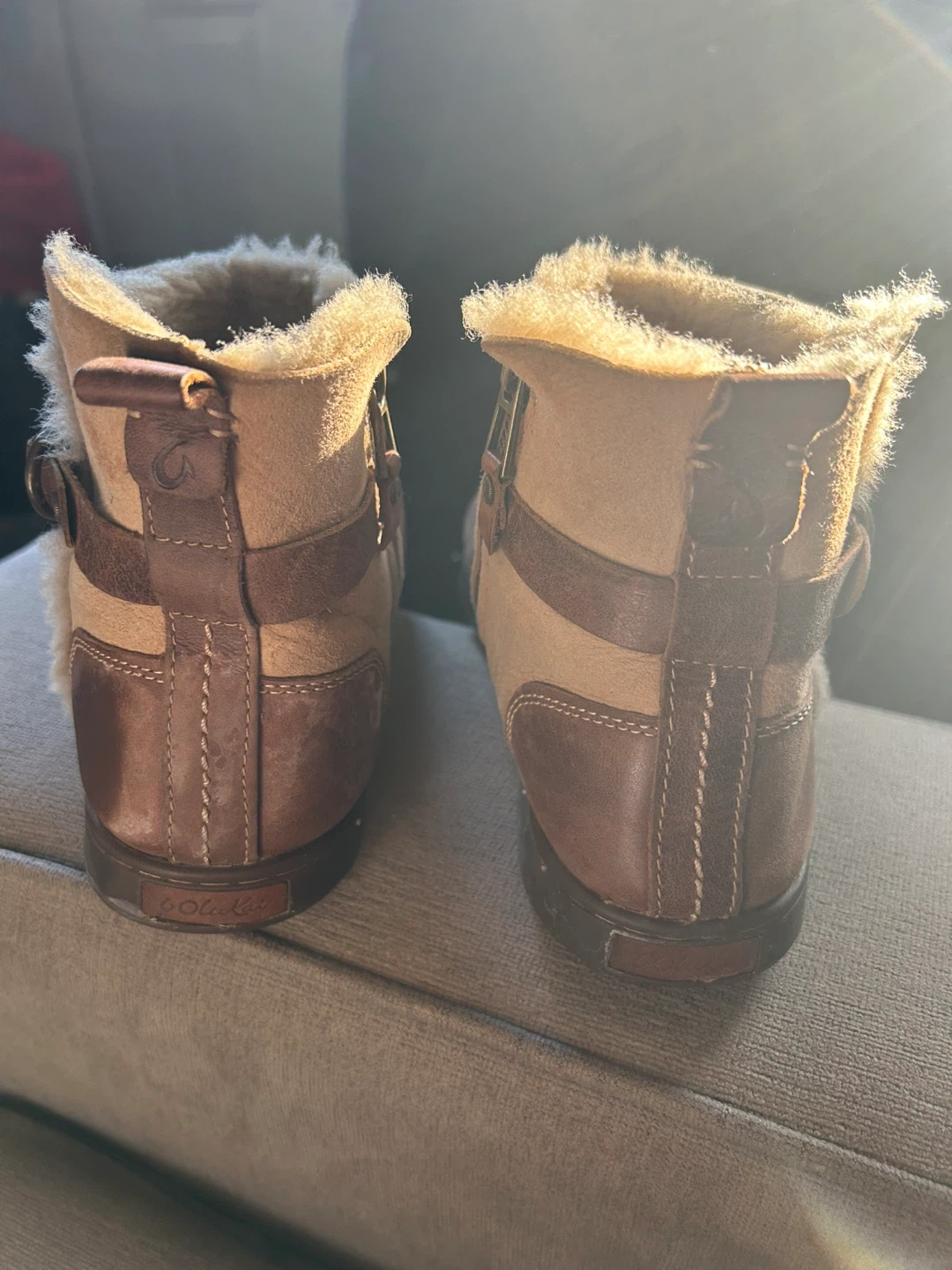 Cozy OluKai ankle boots with a side zipper. These boots feature a mix of brown leather and tan suede with a fluffy shearling lining. They've got a durable rubber sole with a distinctive pattern.