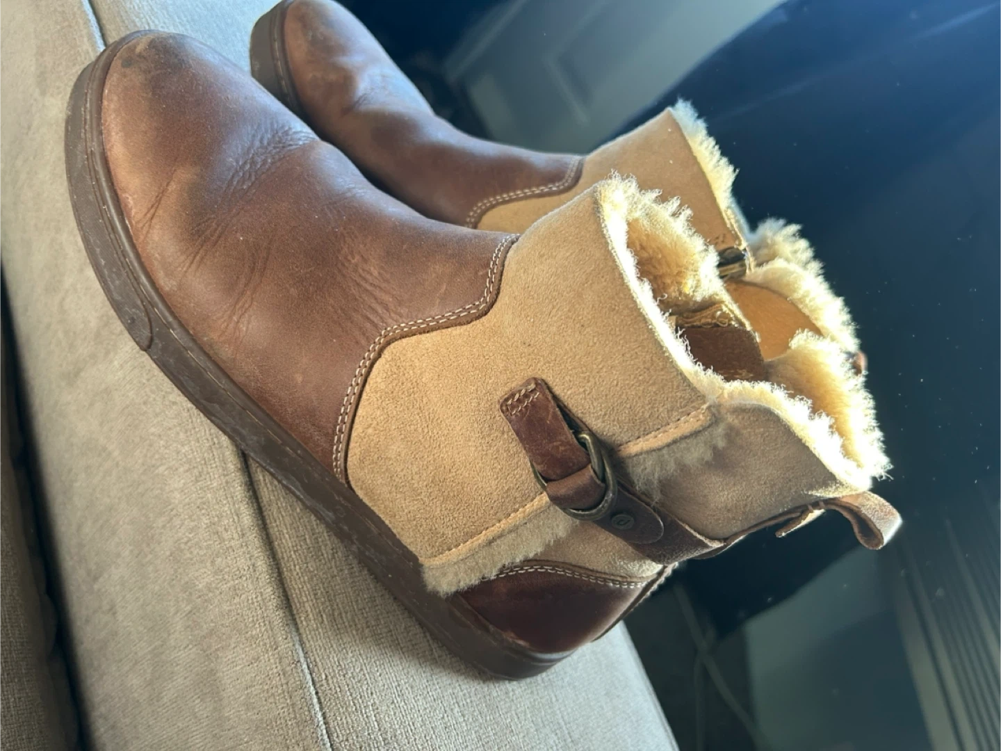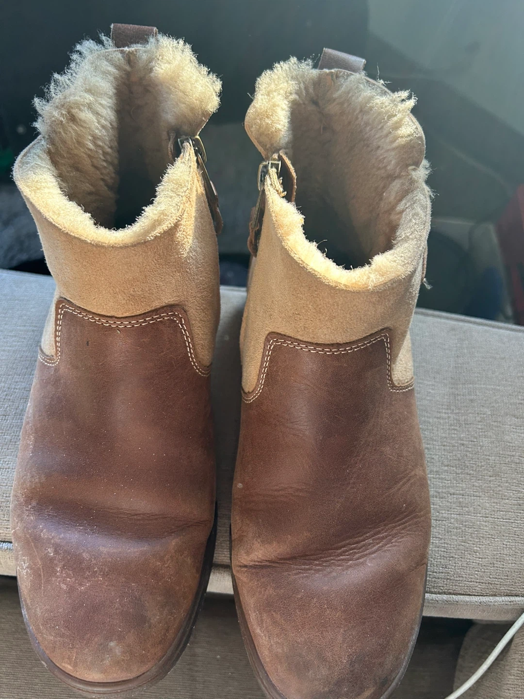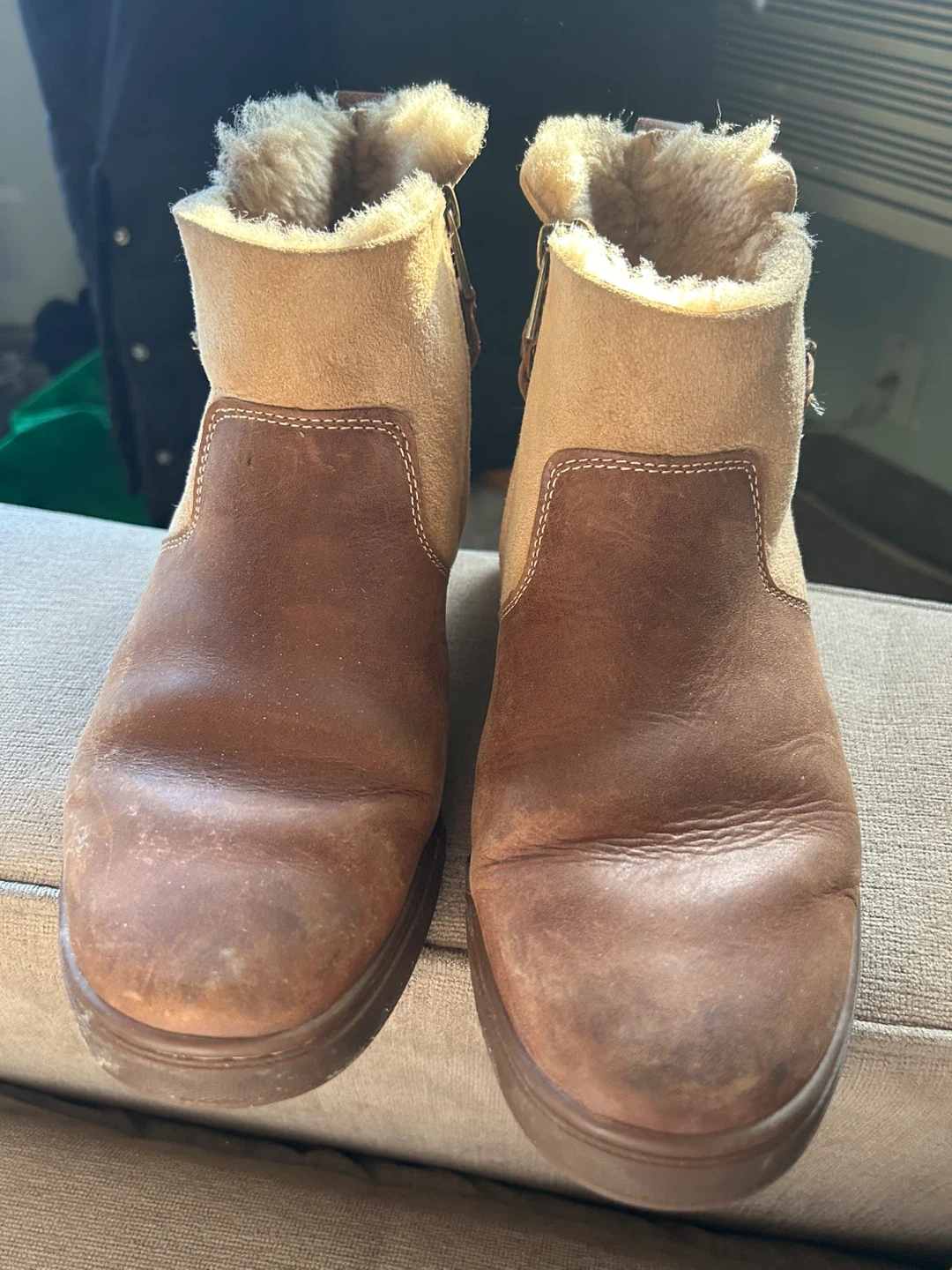 Cozy OluKai ankle boots with a side zipper. These boots feature a mix of brown leather and tan suede with a fluffy shearling lining. They've got a durable rubber sole with a distinctive pattern.