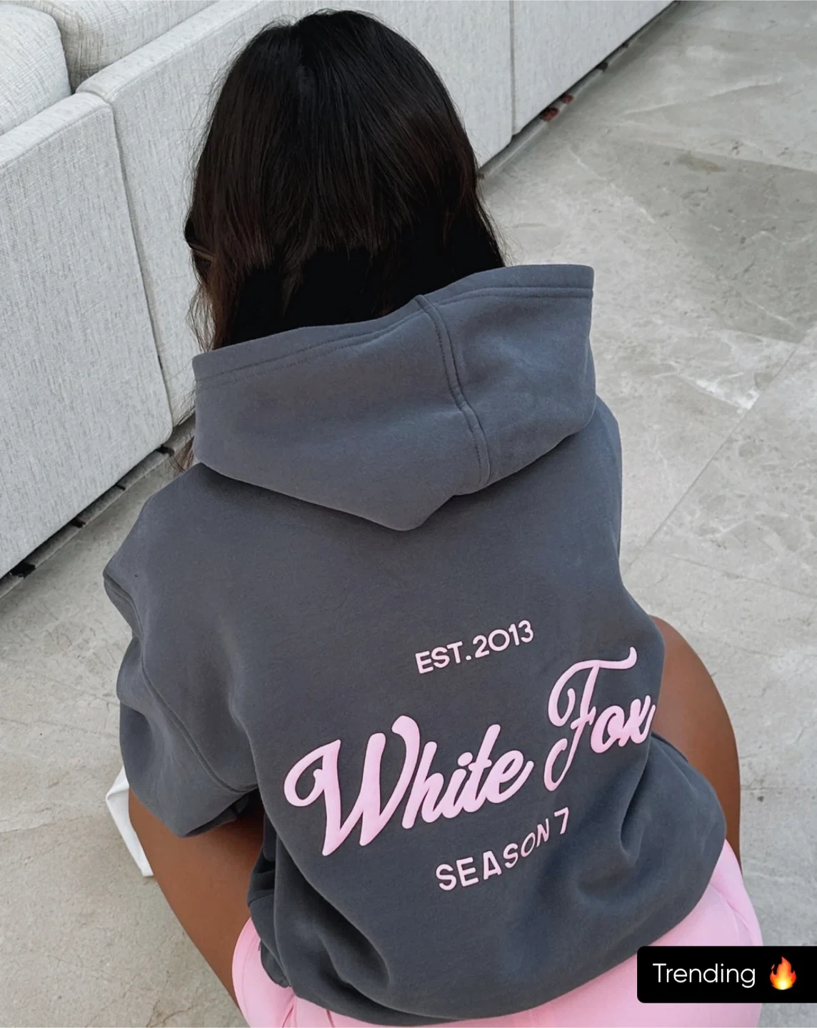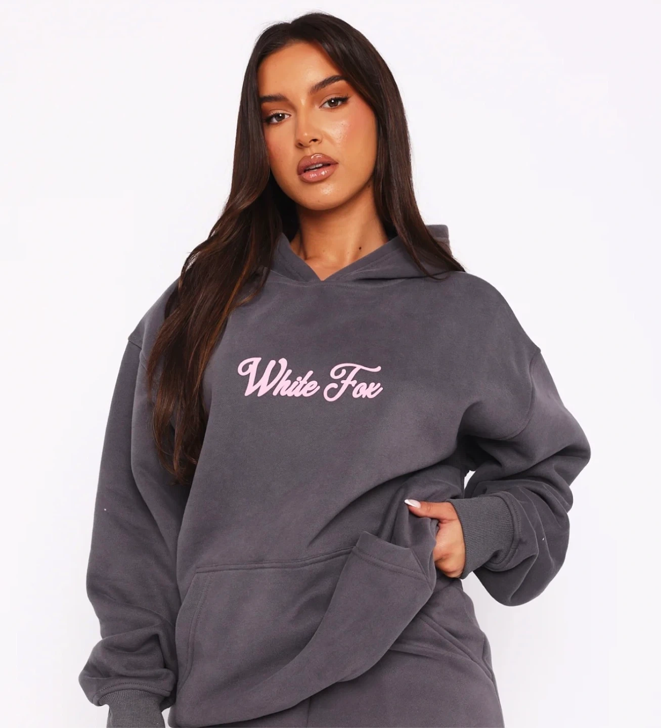 Super cute and cozy White Fox hoodie in a flattering charcoal/monument shade. Perfect for lounging or casual days out!