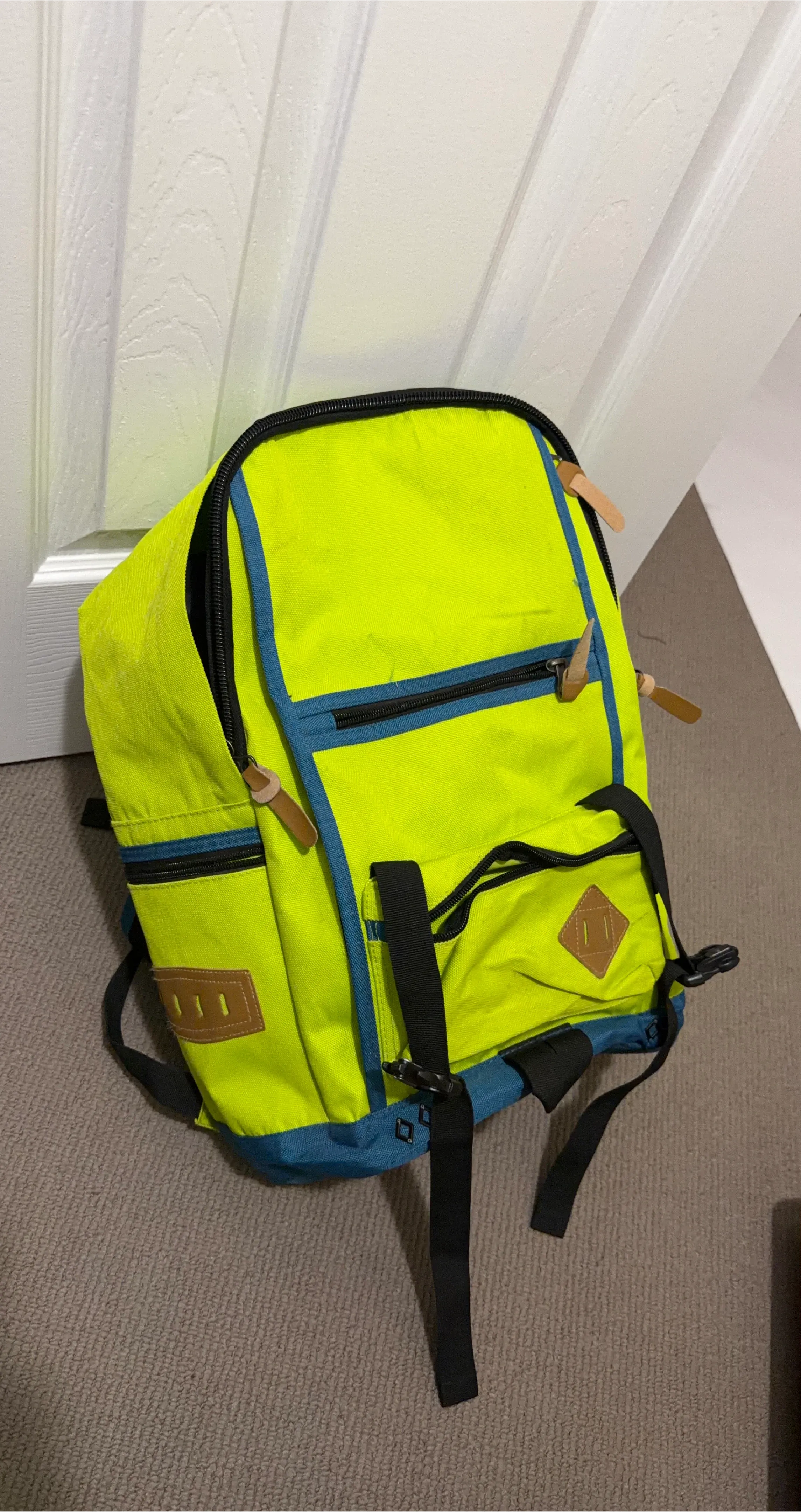 This backpack's main compartment is accessed by a top zipper. It also has a front zippered pocket and two side pockets. It's made of durable fabric with leather accents and adjustable straps. This bag's vibrant colour makes it easy to spot!