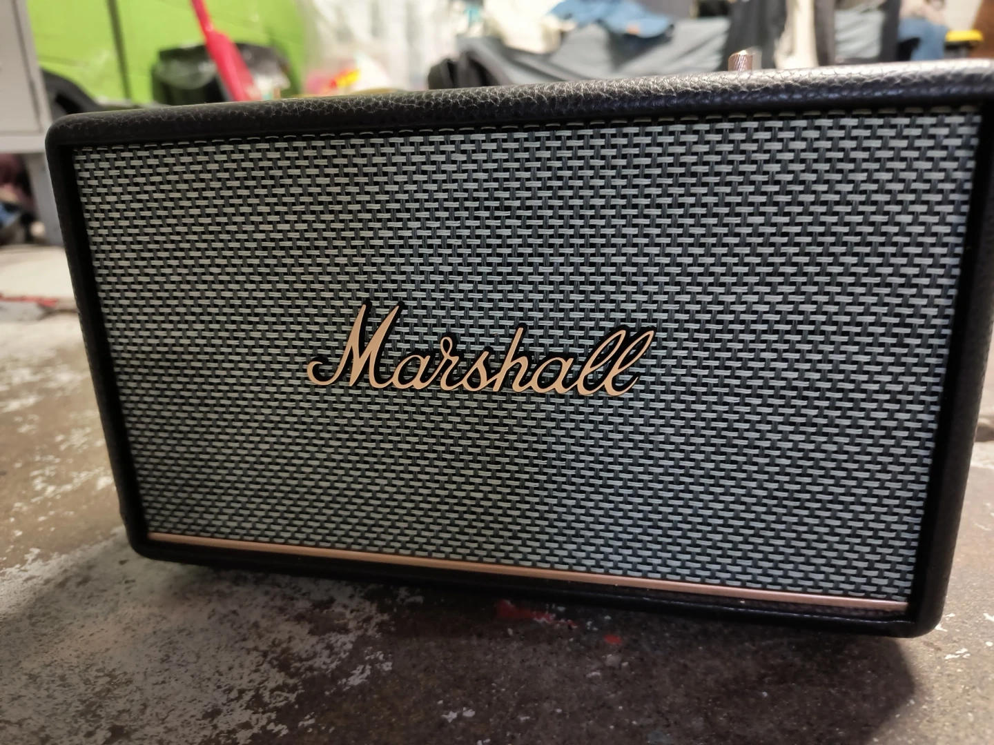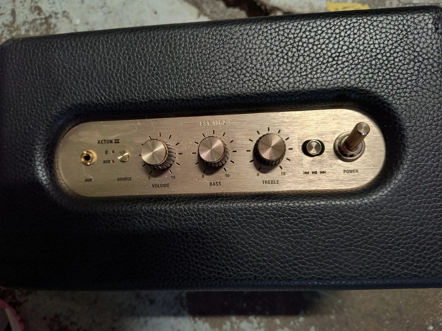 Marshall Acton III Bluetooth speaker. It features volume, bass, and treble controls. Connect via Aux or Bluetooth. Used maybe 2 times. Got them at Christmas.