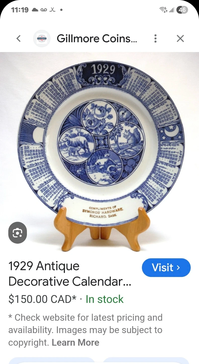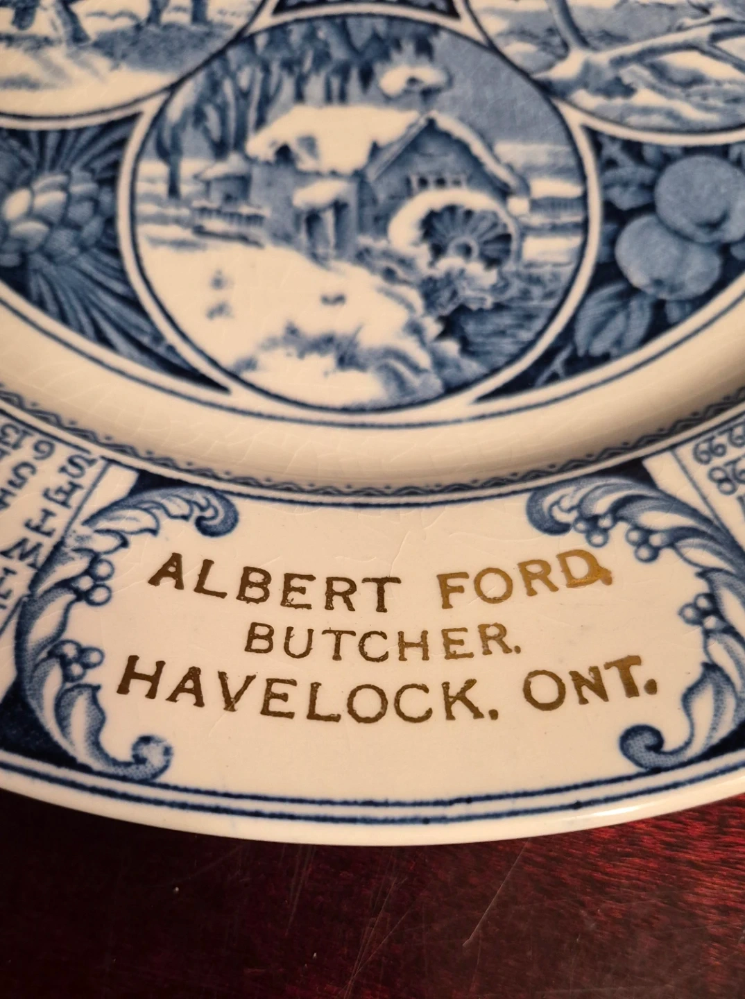 This is a decorative calendar plate from 1929, made by Woods Burslem in England. It features seasonal scenes and a calendar for the entire year. The plate also includes a personalized inscription for Albert Ford, Butcher, Havelock, Ont.