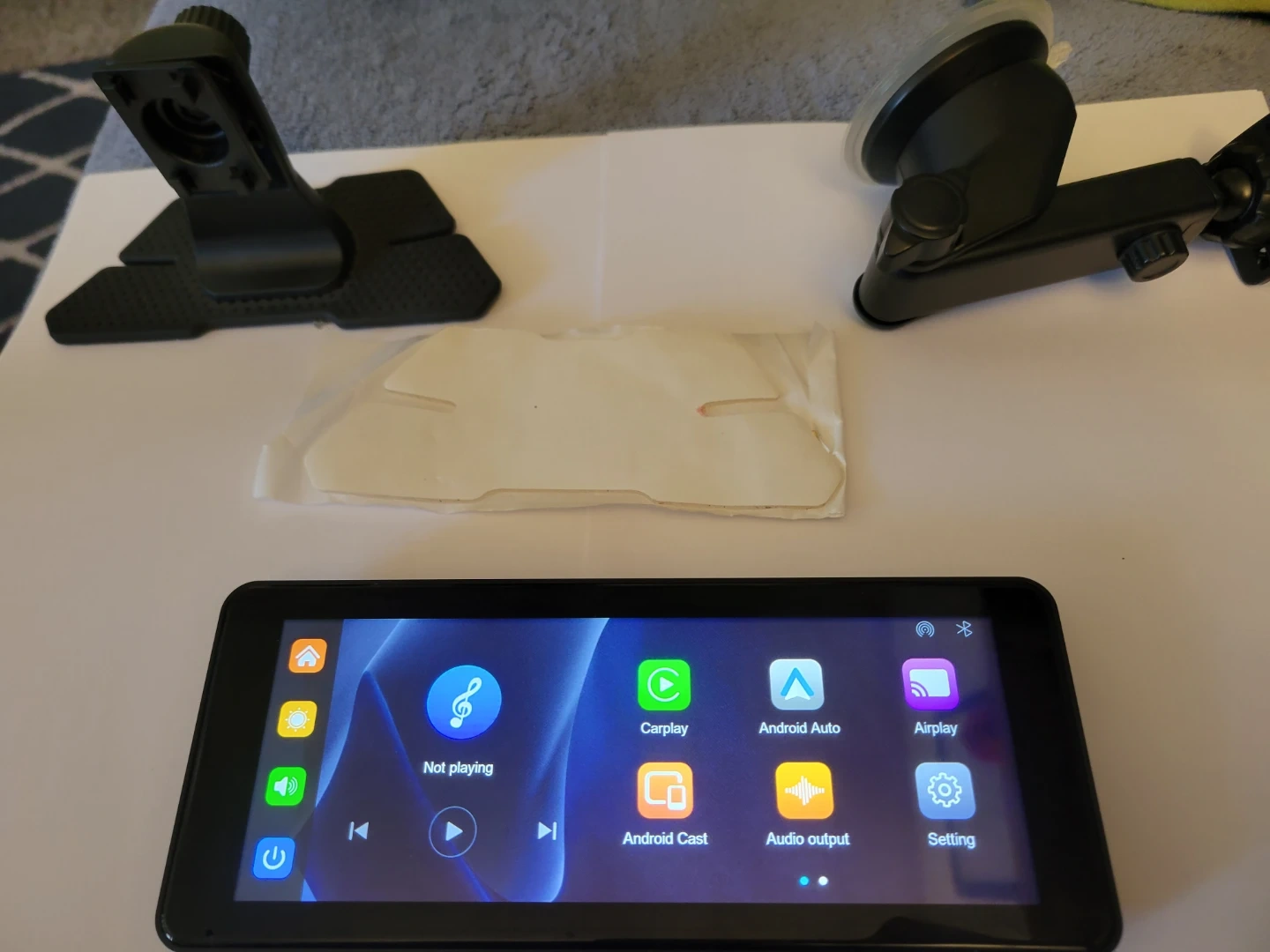 This portable car smart screen display supports Apple CarPlay and Android Auto. It connects via Bluetooth and includes suction cup and adhesive mounts. Screen size is not specified.