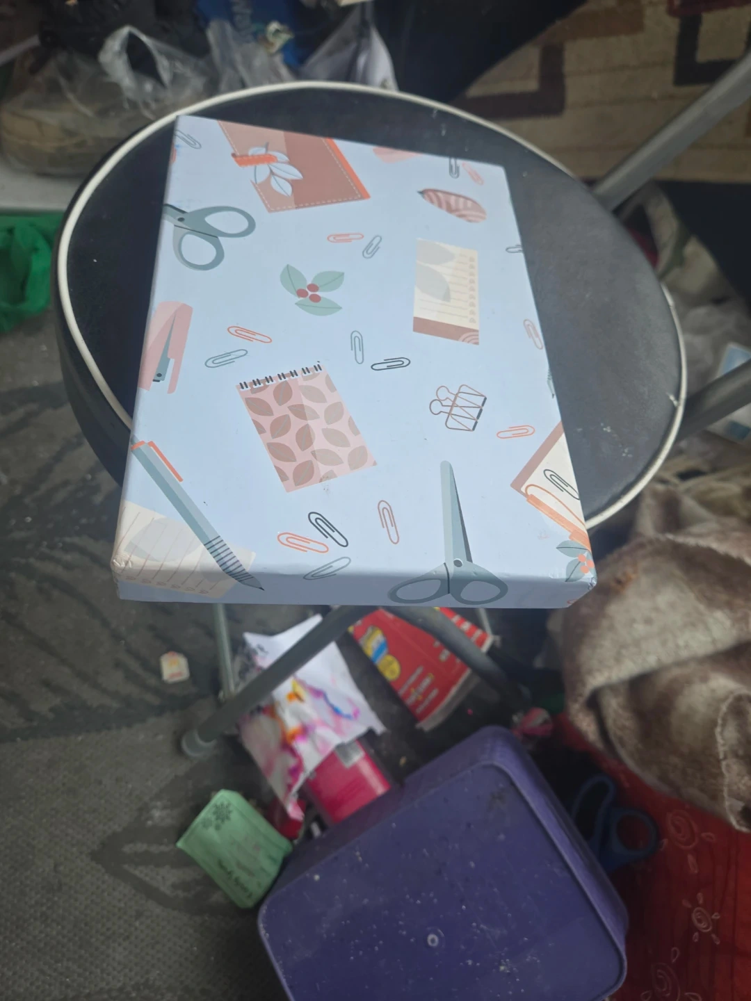 This journal is designed for daily self-care reflection. It includes a black journal with a gold foil title and a black ballpoint pen. The cover features a charming pattern of stationery items. Pick up only please
