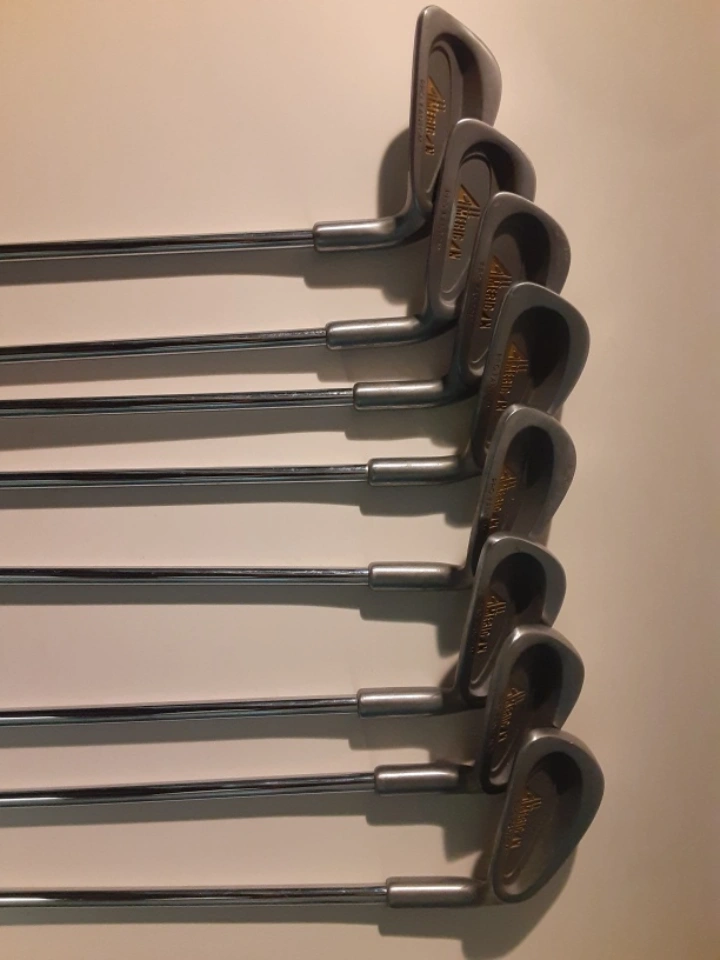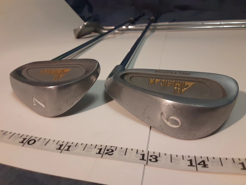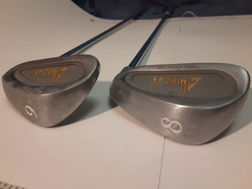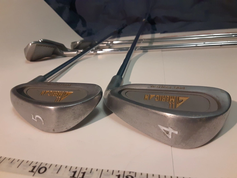Set of eight All American Pro Phantom right handed golf clubs. Includes 3-iron through PW. Blue and white grips. Okay condition, rust spots along shafts, some better/worse than others.