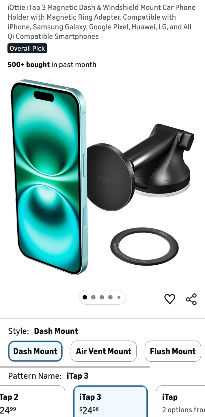 This is the iOttie iTap 3 magnetic car phone mount for dash or windshield use. It comes with a magnetic ring adapter and suction cup mount. Compatible with Qi-enabled smartphones.