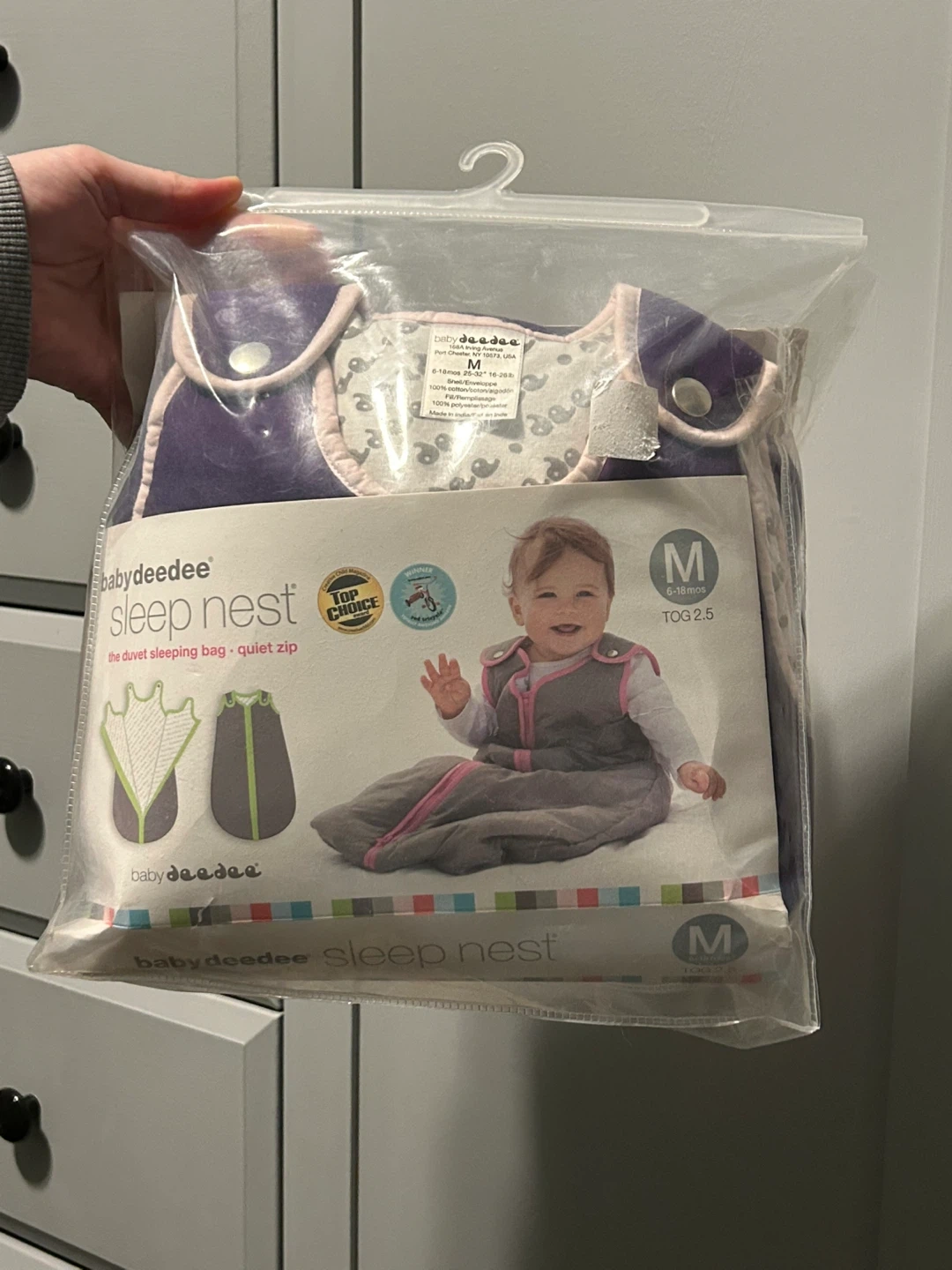 Selling a baby deedee Sleep Nest in size M, suitable for babies 6-18 months! It's a duvet sleeping bag with a quiet zip, making it perfect for a good night's sleep. The TOG rating is 2.5. Never worn, brand new.
