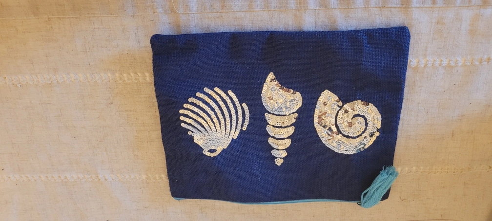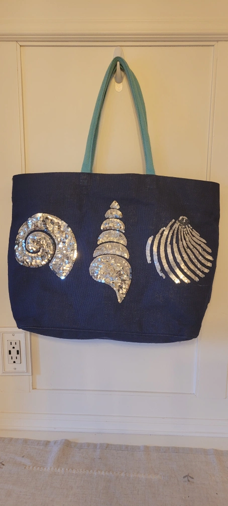 I'm selling a navy blue tote bag from Mud Pie! It has a cute design with silver shells. This bag is perfect for the beach or everyday errands and includes a matching interior accessory bag with zipper. only used 1x