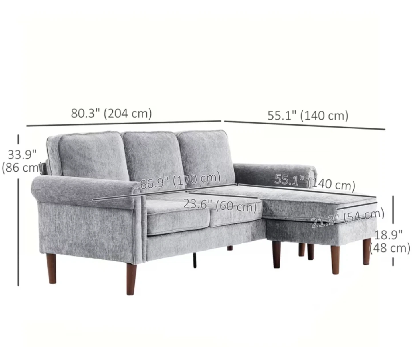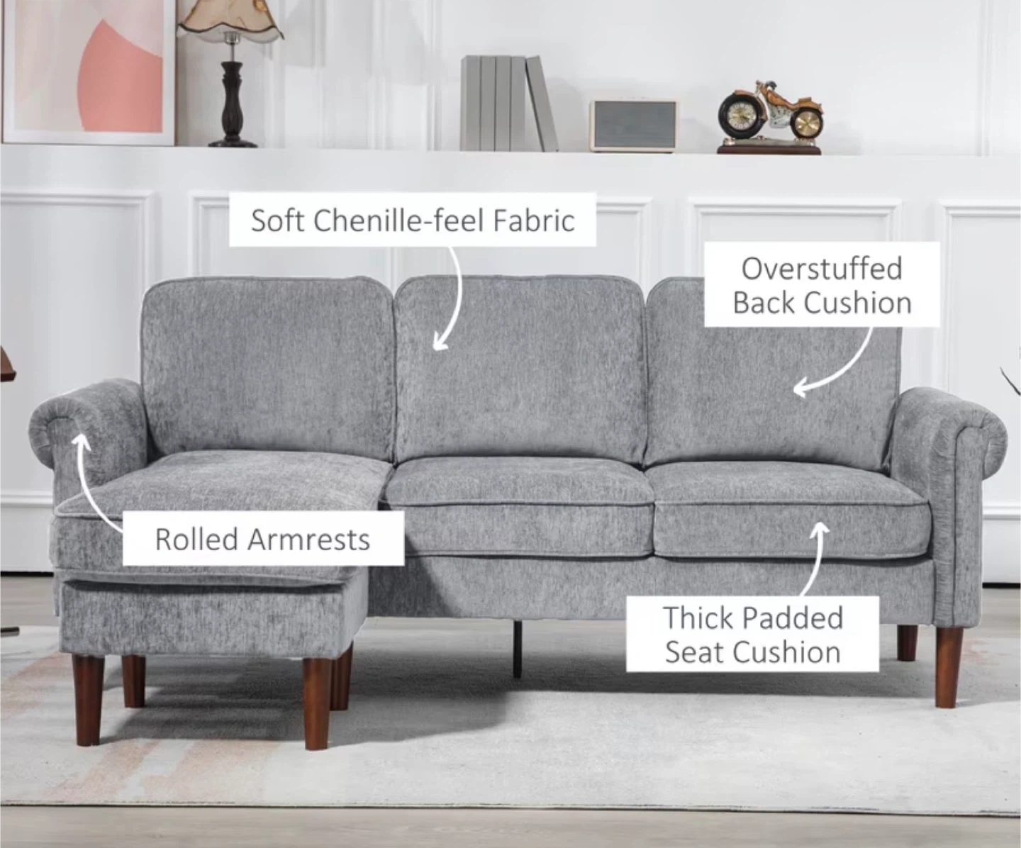 This reversible chaise lounge sofa features soft chenille-feel fabric and overstuffed back cushions. It has rolled armrests and thick padded seat cushions. The chaise can be configured on either the left or right side. Overall dimensions are 80.3" wide and 55.1" deep.